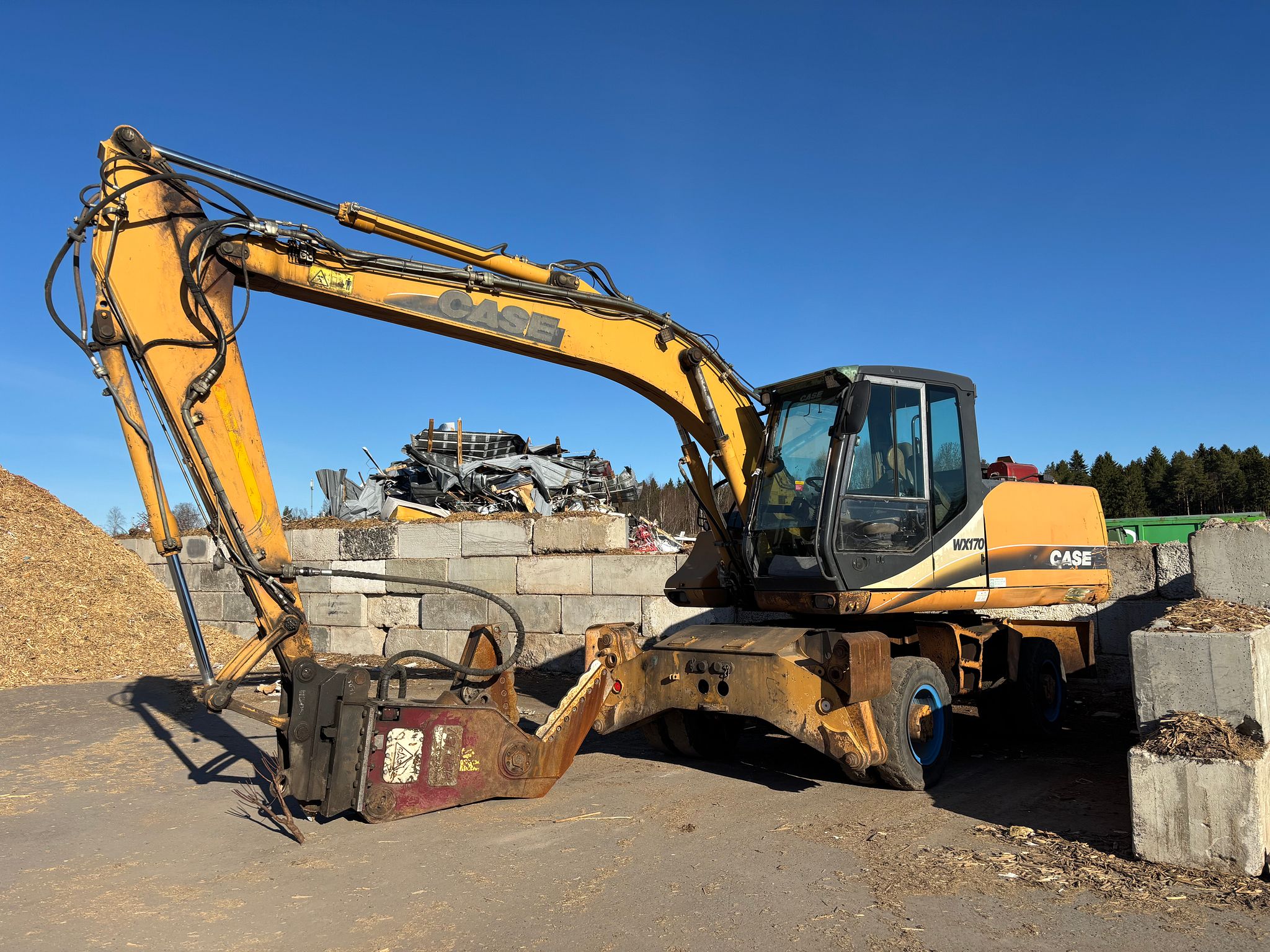 Kuvassa olevalla koneeseen liitetyllä leikkurilla voidaan leikata esim. kaislaa ja ruokoa jopa hehtaareja päivässä. Leikkuu maissa onnistuu myös tarvittaessa.