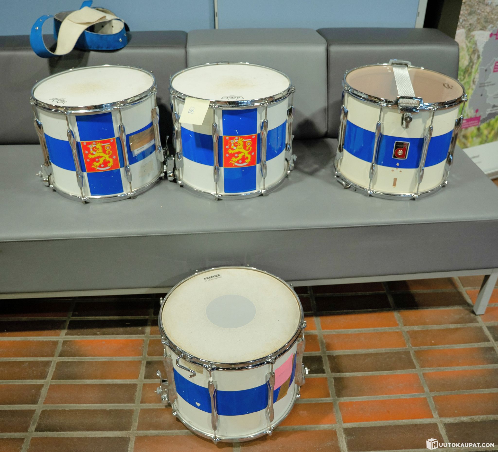 4kpl Premier Marssirumpuja ja 2 kpl kahtohihnoja. Rummut ovat Suomen lipun värisiä ja niitä koristaa etupuolella Suomen Leijona. Rummut ovat kuluneita mutta toimivia. Olleet runsaassa käytössä.