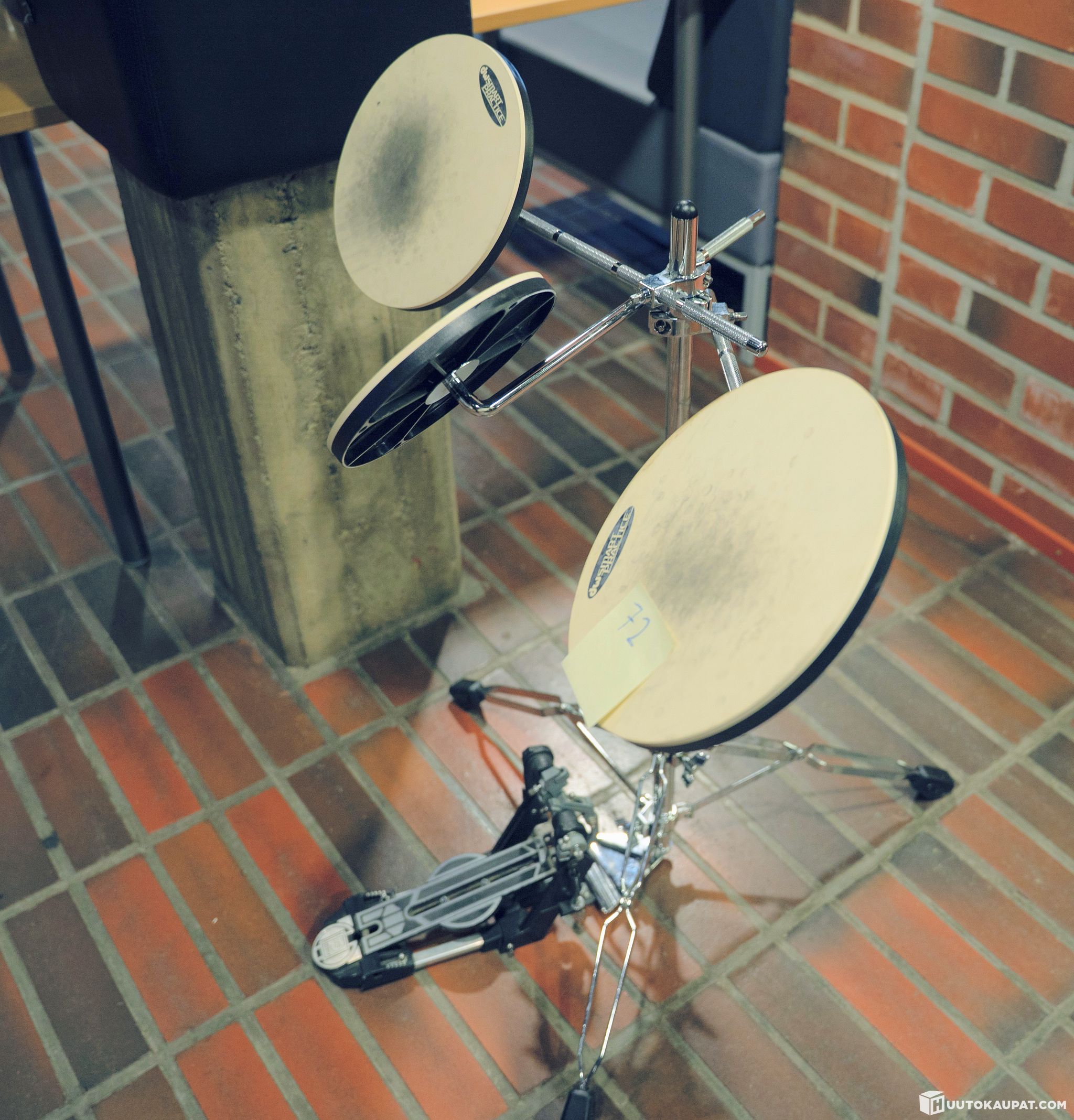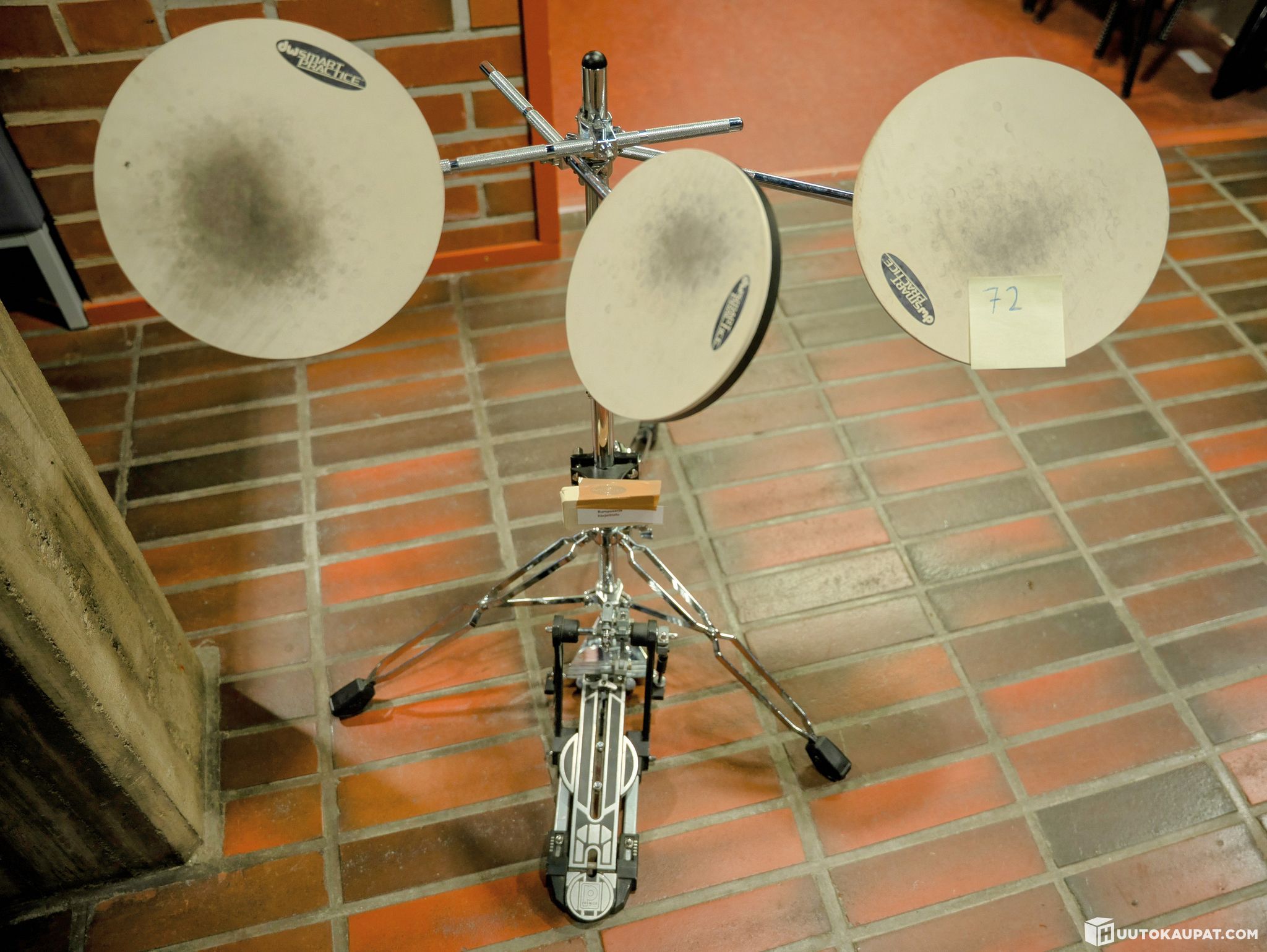 Harjoittelu rumpusetti. Tämä setti ei sisällä yhtään rumpua ja vaan niin sanottuja rumpupadeja. padeja 3 kappaletta. Rungossa oma padi myös bassorummun pedaalille. Mukana myös bassorummun pedaali josta puuttuu nuija ja kiristysruuveja.