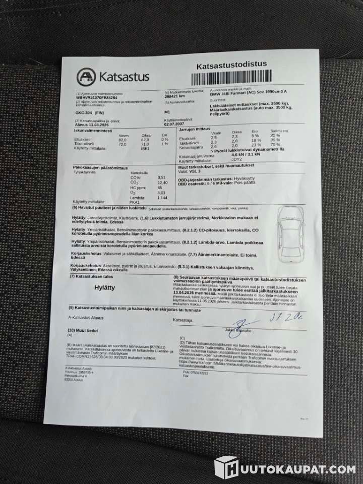 Auto käy kolmella välillä. Katsastuksesta ei mennyt läpi, oheisessa kuvassa näkyy katsastustodistus.