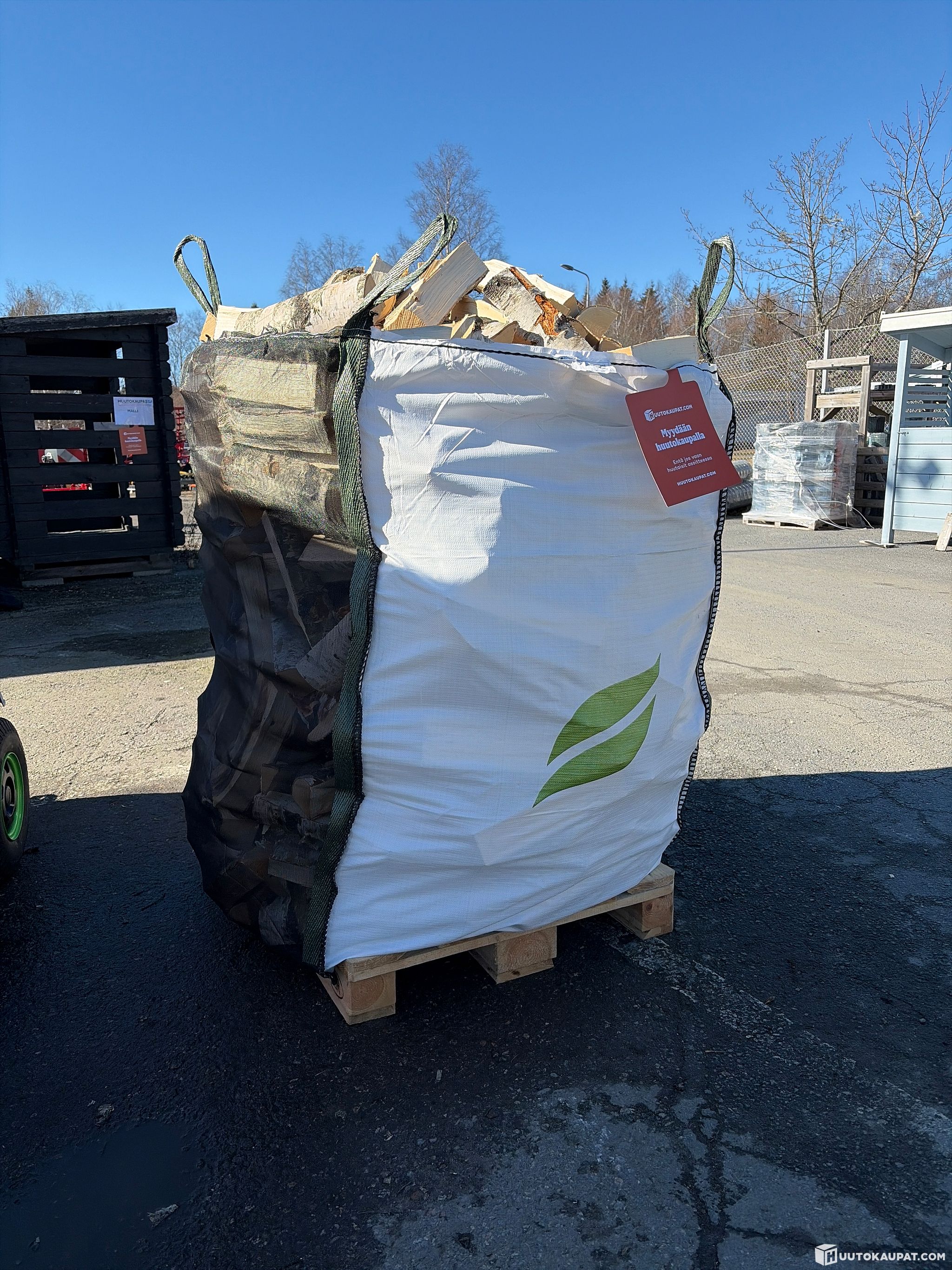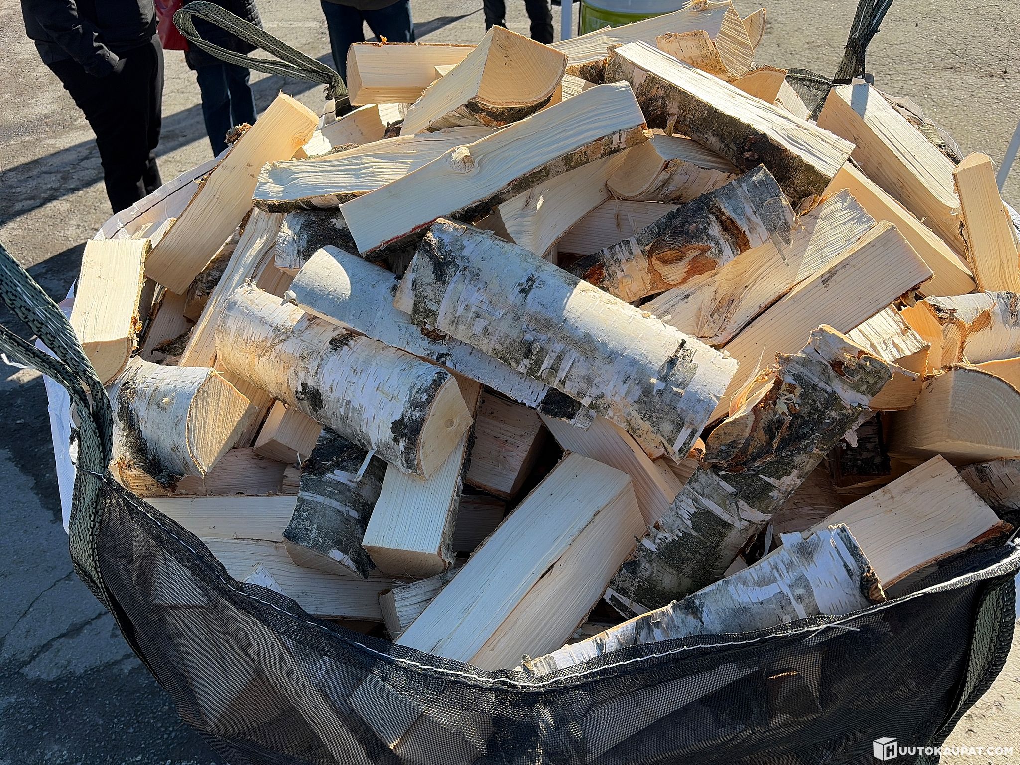 Hankkijan konepäiviltä, esittelykoneen työstämää tuoretta klapia säkillinen