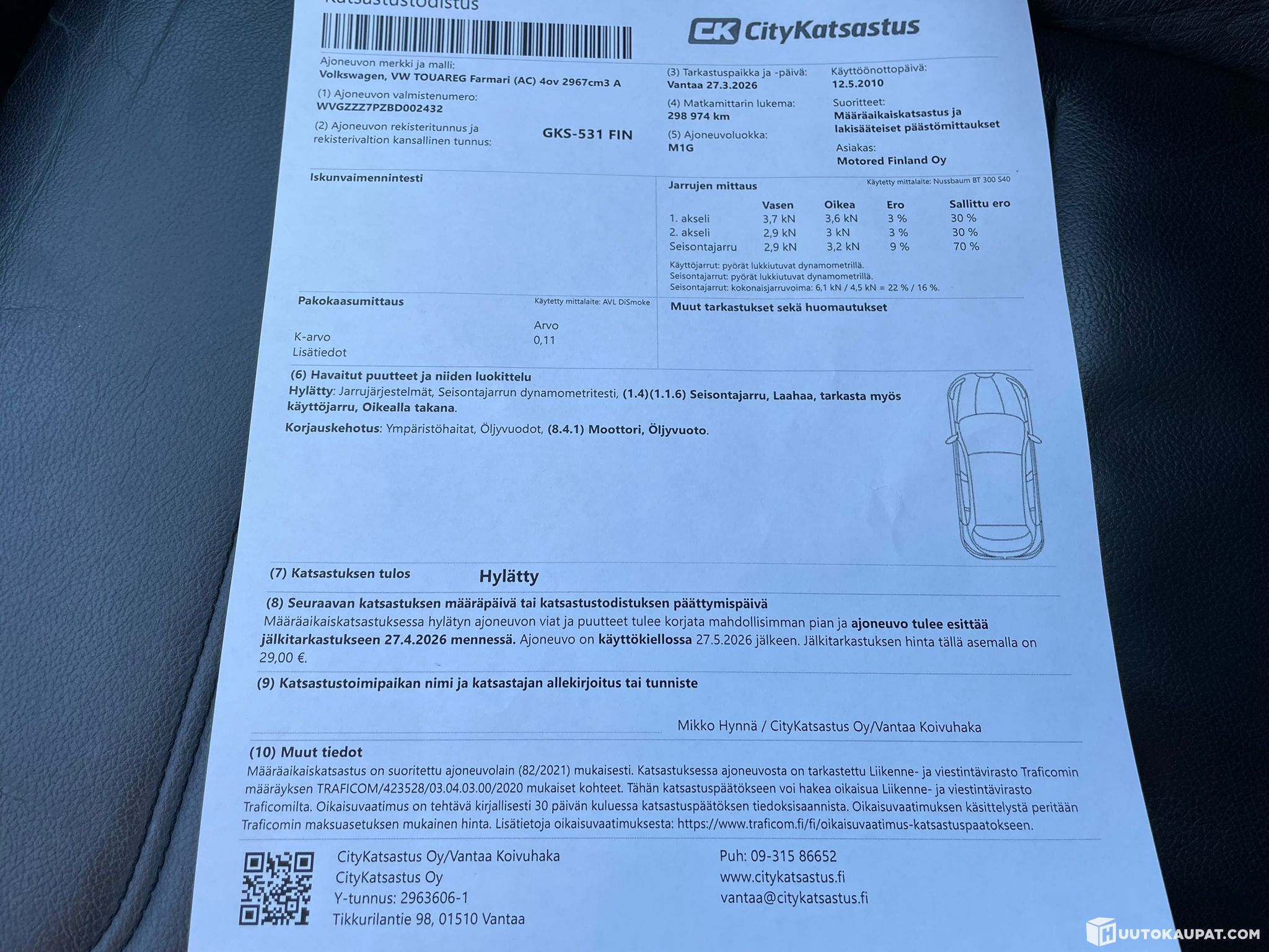 Käytettiin auto katsastuksessa ja siellä ilmeni pieni moottoriöljyn vuoto ja auton sähköinen käsijarru laahaa. Leimalle riittää että sen käsijarrun korjaa.
