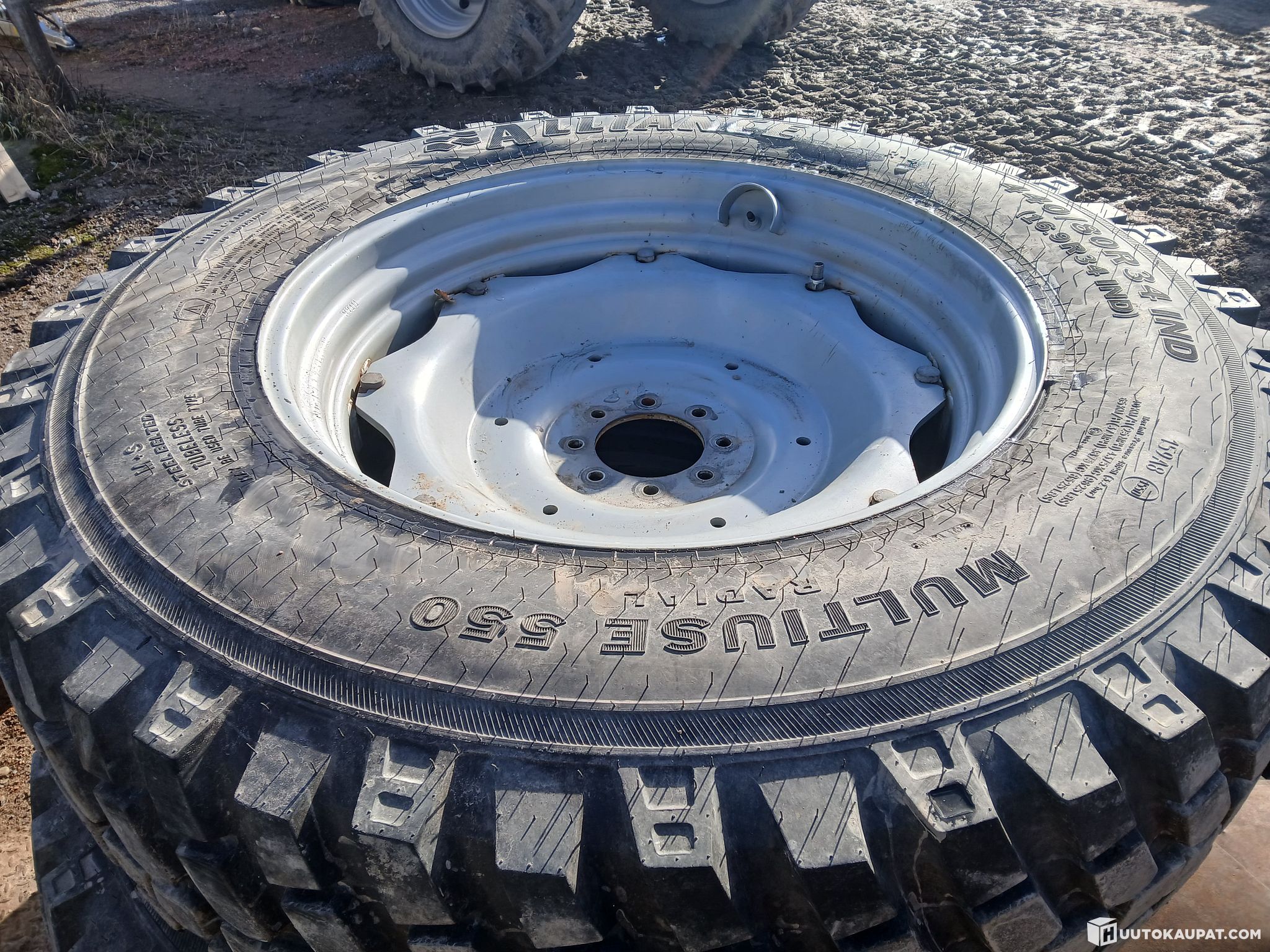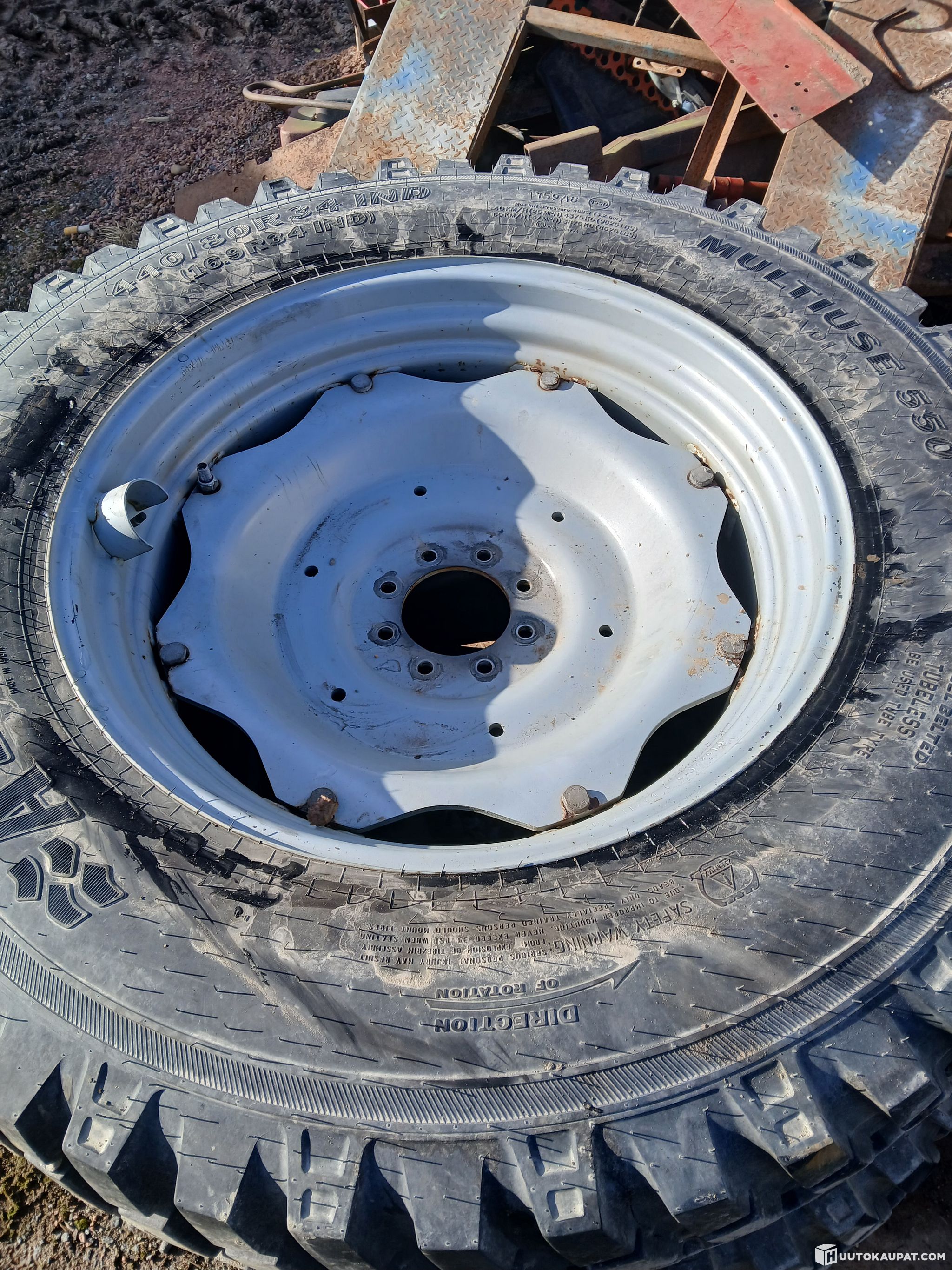-Takarenkaat lähes uudet 440/80R34 159A8/155D TL Alliance 550 M+S SB (16.9R34) (kunto 99%) hokki tyylisellä kuviolla.