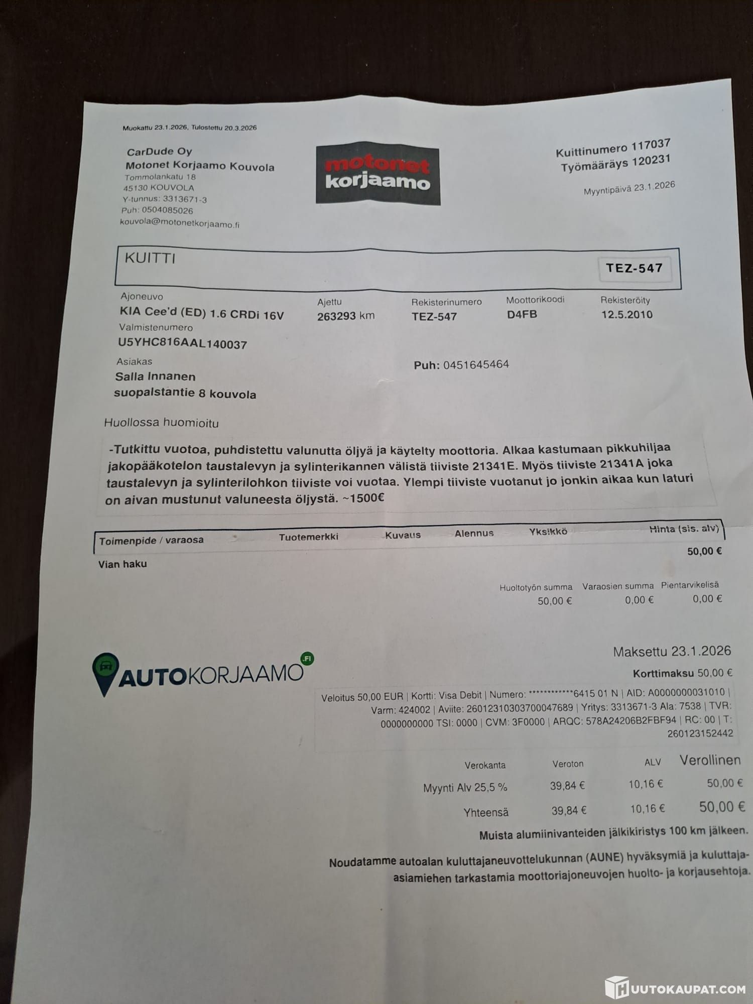 Autolla ajettu todetun öljyvuodon jälkeen normaalisti noin 3000km. Öljyä ei ole tarvinnut lisätä ja öljypinta säilyy normaalina, vaikka öljyä hieman tulee konehuoneeseen.