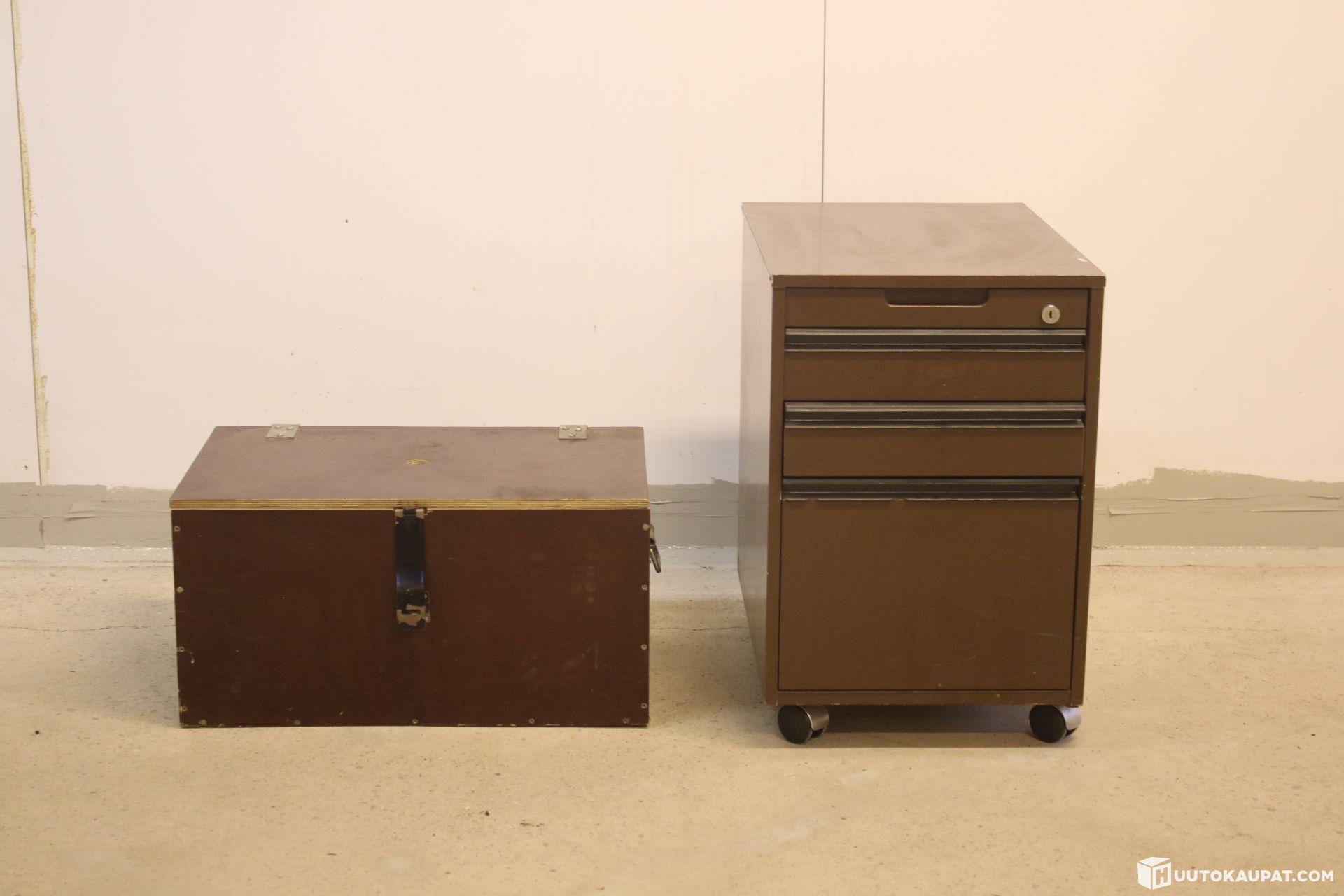 Ruskea vetolaatikosto pyörillä ja säilytysarkku.