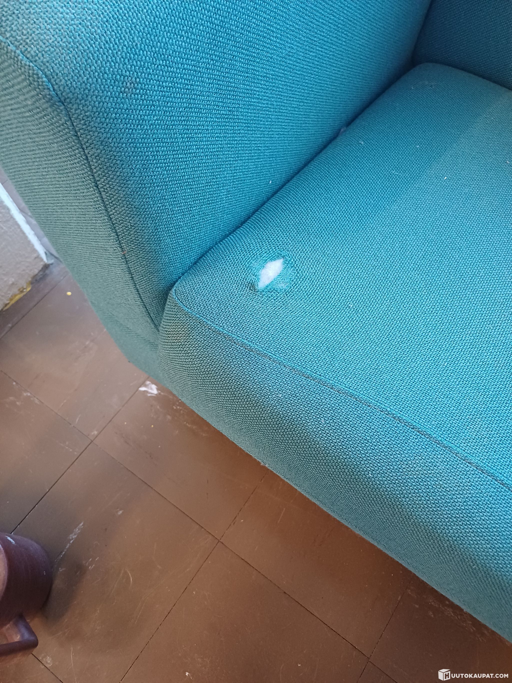 Kuvista näkee kankaassa olevat kulumajäljet eli kahdessa kohtaa on kankaassa selvä reikä