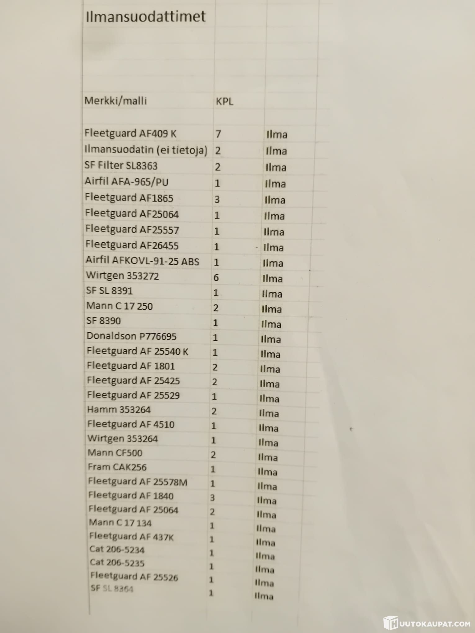Kuvassa 3 listaus mitä suodattimia pitäisi olla, mutta voi olla heittoakin kun ei ole tarkistettu listaa.