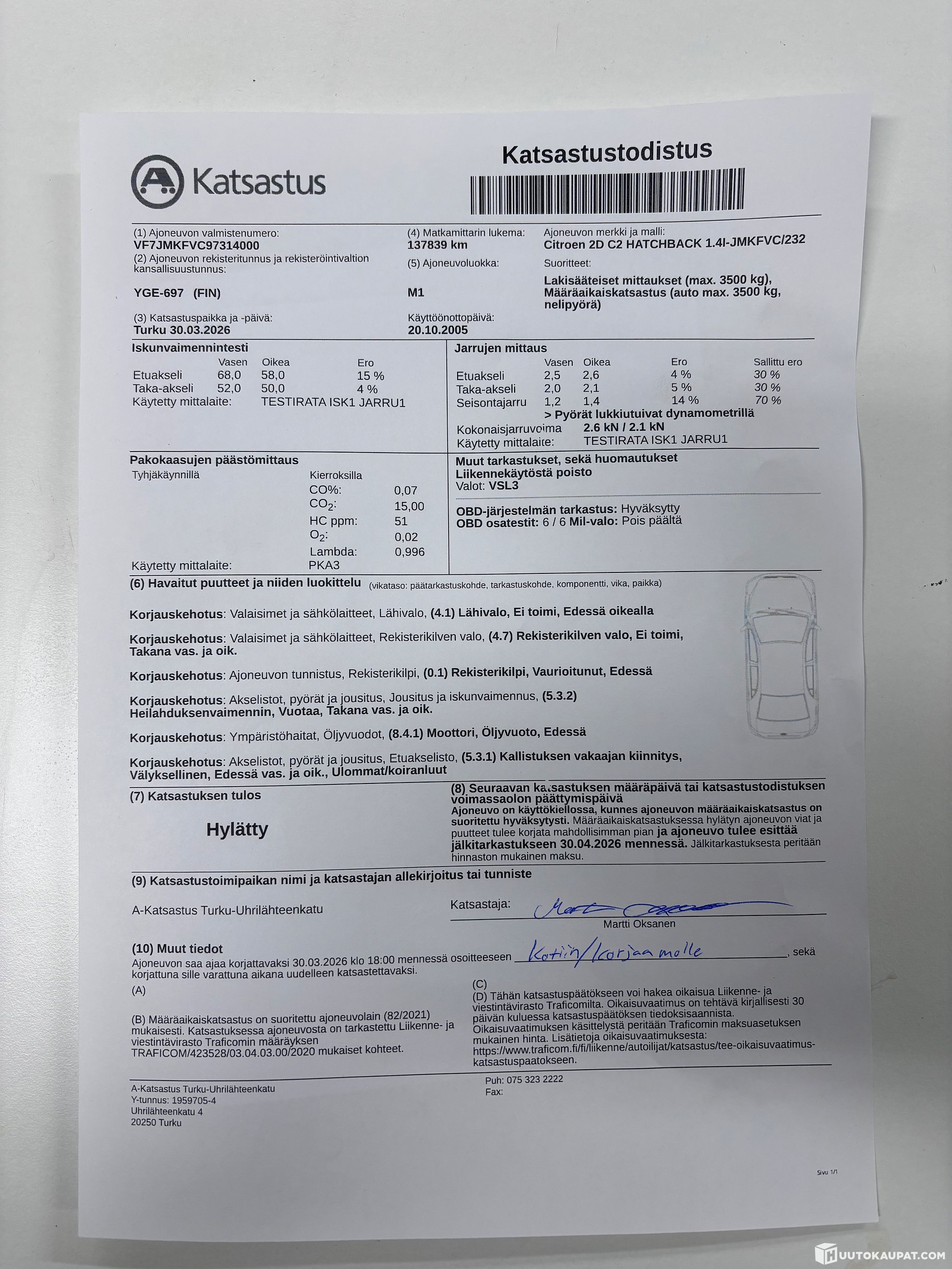 Myydään katsastuksen vikalistalla, huomautukset kuvattu