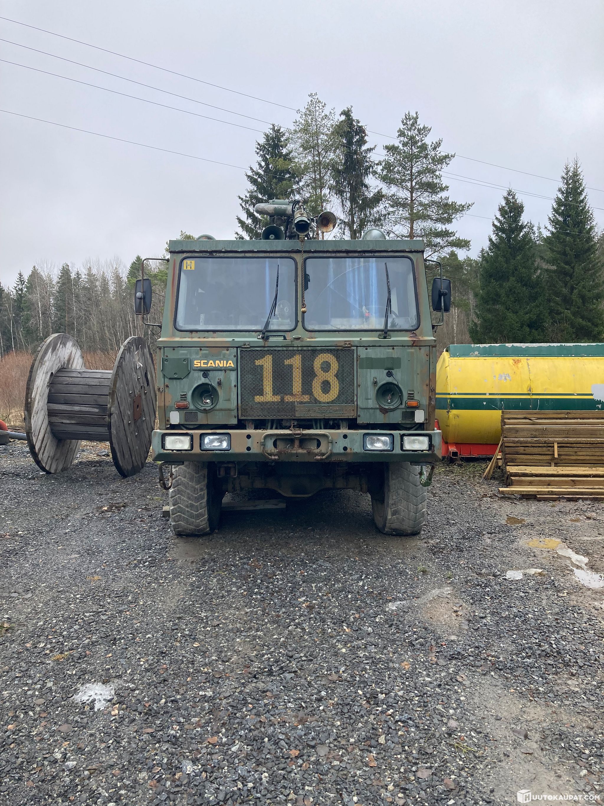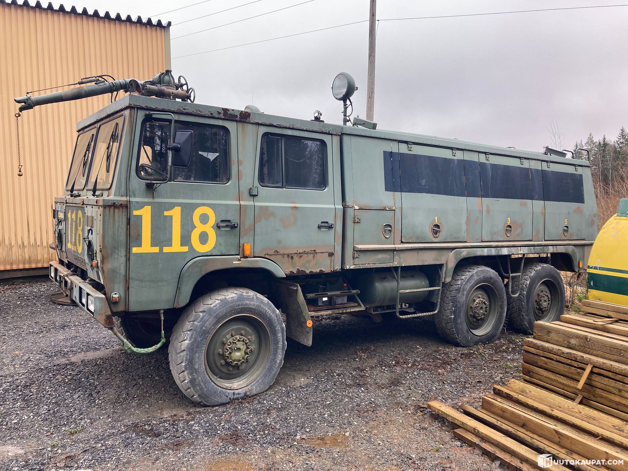 Vanha Ruotsin armeijan paloauto vesitykillä ja isolla vinssillä. Käyntikunnosta ei tietoa, vettä päässyt ohjaamoon jonka takia sähkölaitteissa kaiken laista vikaa.