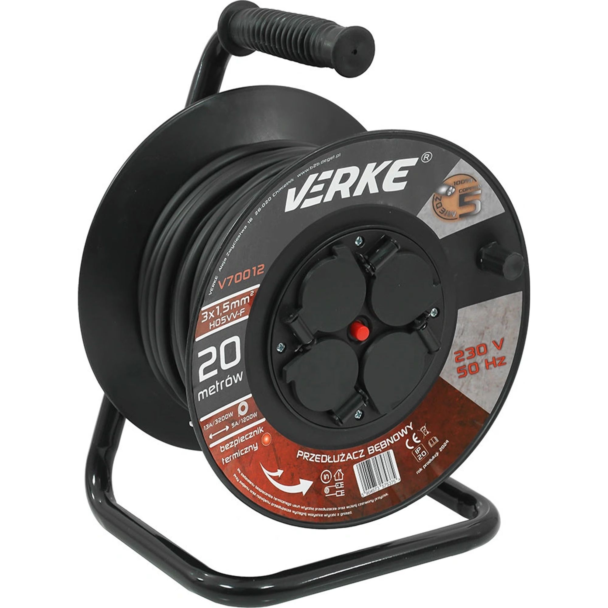 Korkealaatuinen 20 metrin jatkojohtokela, jossa on neljä pistorasiaa. Kaapeli on valmistettu kolmesta kuparijohdosta, joiden poikkileikkaus on 1,5 mm². Tämä poikkileikkaus mahdollistaa neljän laitteen samanaikaisen liittämisen, mikä on erityisen hyödyllistä rakennustyömailla tai työpajoissa. Johdot on päällystetty PVC-eristyksellä, joka on erittäin kestävä mekaanisille vaurioille, sääolosuhteille ja kemikaaleille. Jatkojohto on varustettu lämpösulakkeella.