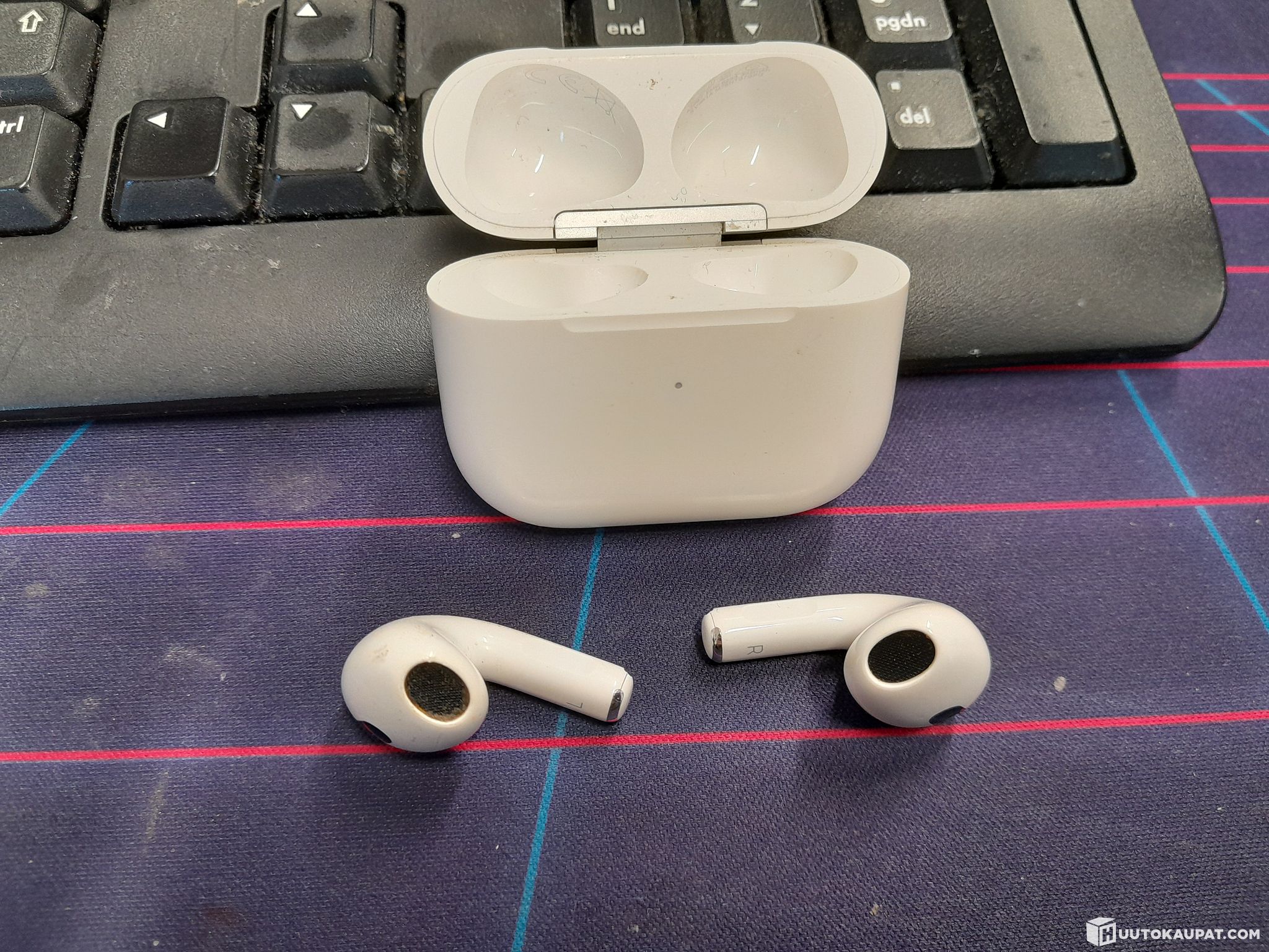 Käytetyt. Mukana napit, latauskotelo ja laturi.