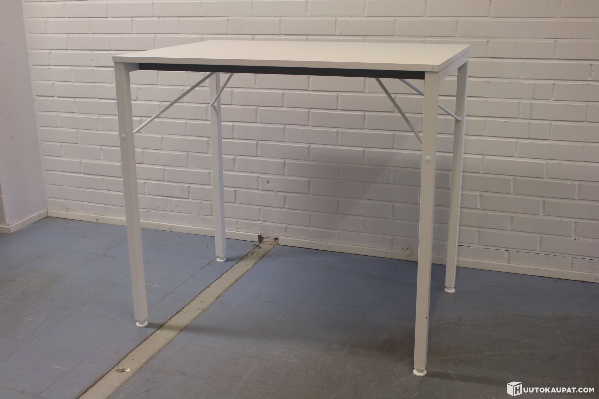 Tyylikäs korkeajalkainen pöytä valkoisella kannella ja tukevilla jaloilla.