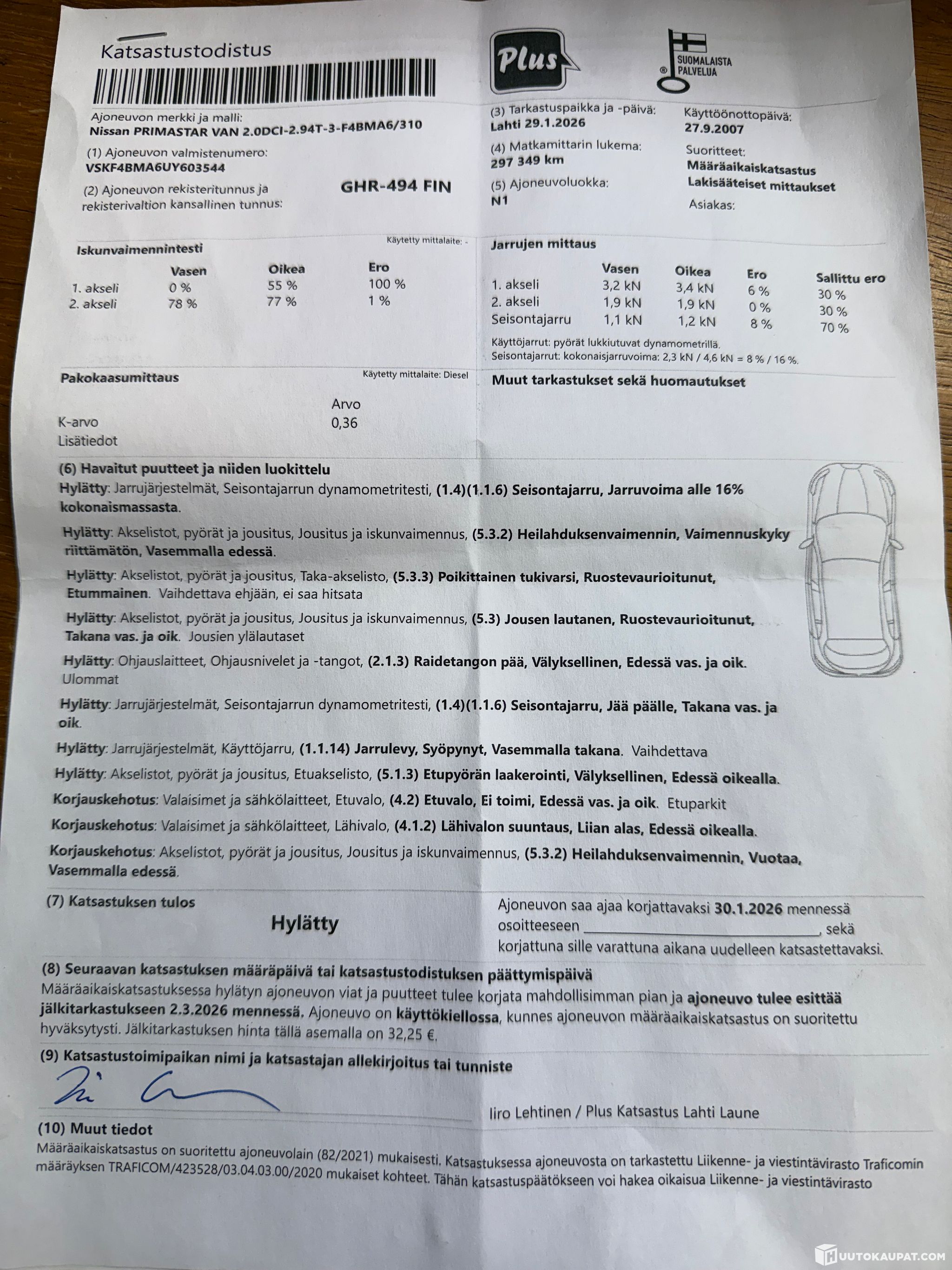 Katso kuva. Auto hylätty katsastuksessa. Ei tieliikenne kelpoinen. Webasto on mutta ei toimi