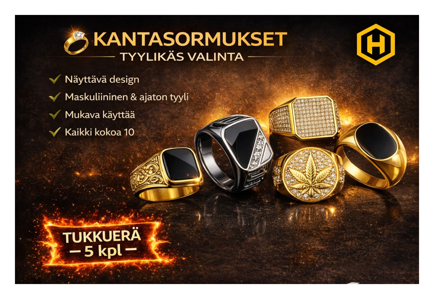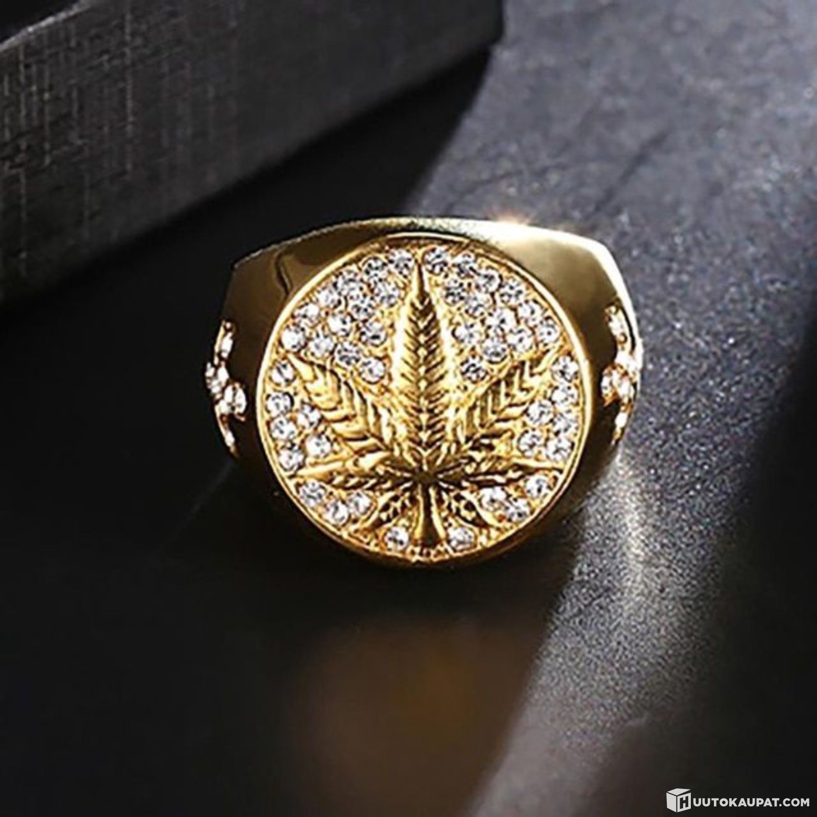 Hakusanat: kantasormus, sormus, lehtisormus, kultasormus, iso sormus, näyttävä sormus, miesten sormus, naisten sormus, unisex sormus, kivisormus, bling sormus, hiphop koru, statement sormus, kultainen sormus, muotisormus, koko 10