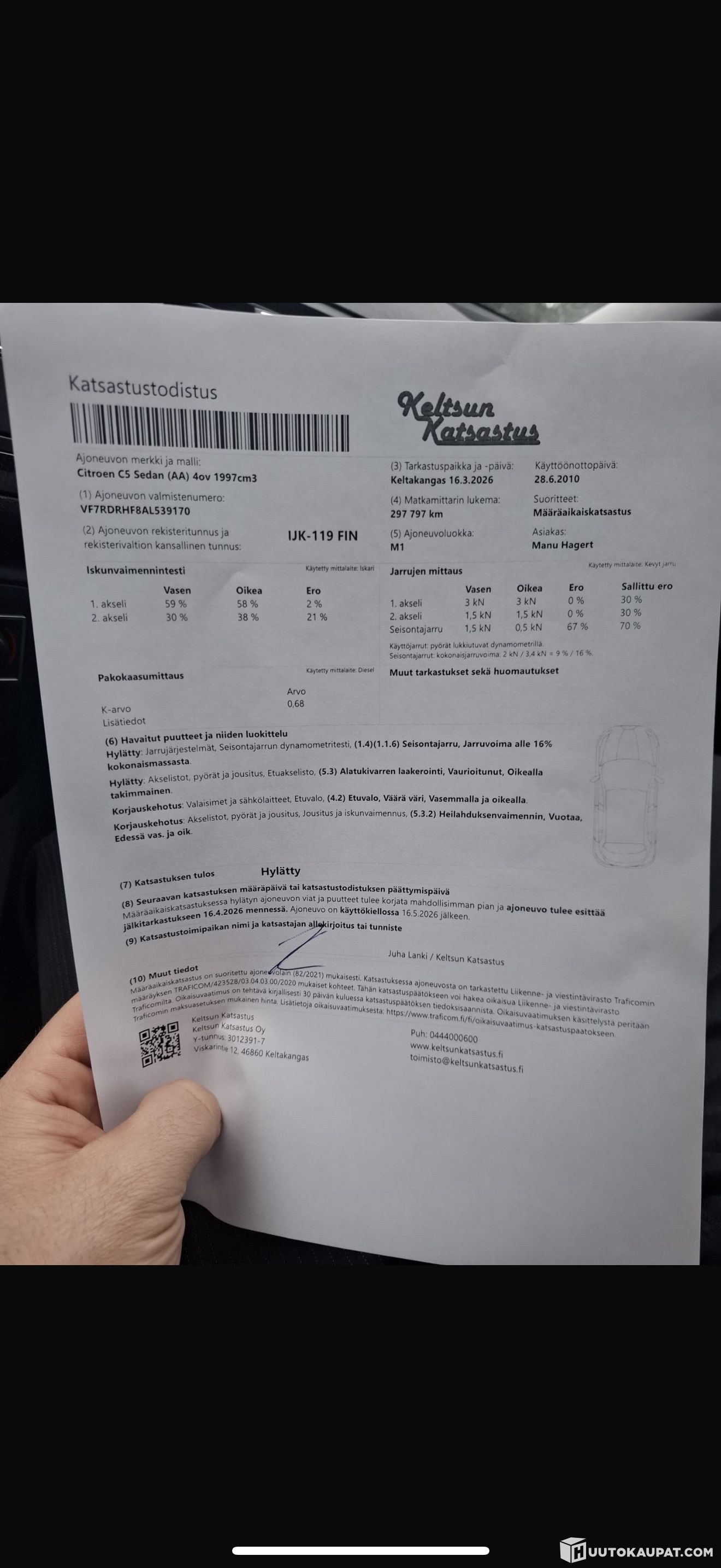 Katsastuksessa hylky alatukivarren laakeroinnista sekä että käsijarru ei pidä tarpeeksi. Kiristämällä menee läpi katsastuksesta.