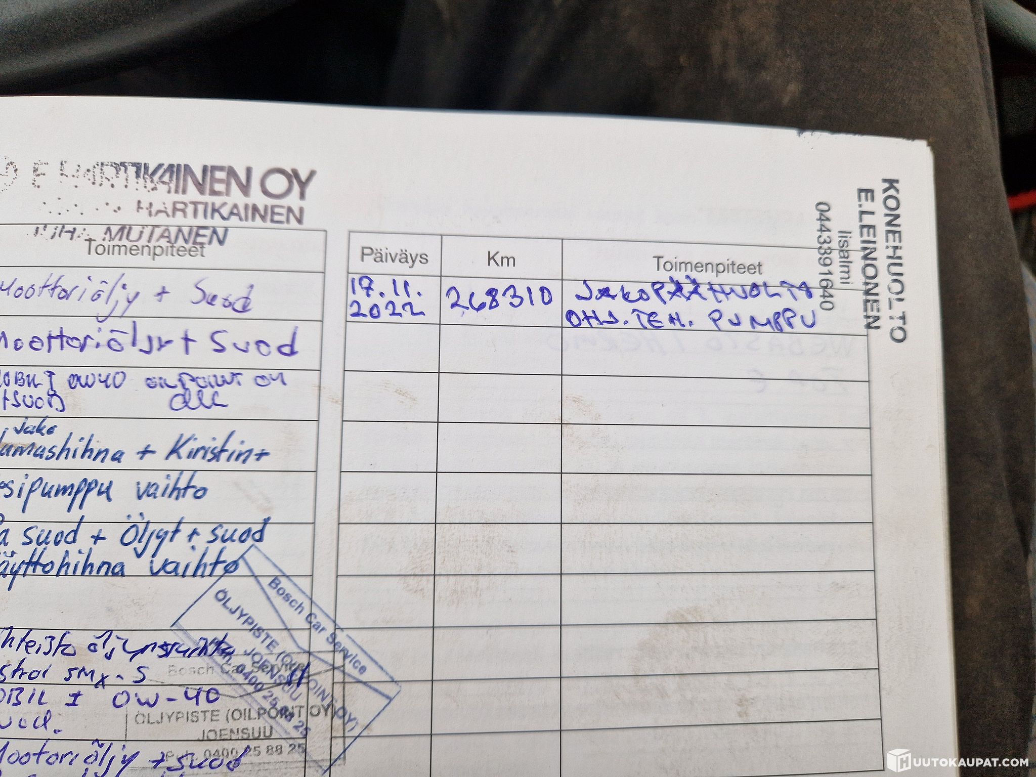 Katsastuksessa tuli huomautus katkenneesta pakoputken kiinnikkestä, muuten ei huomauttamista.