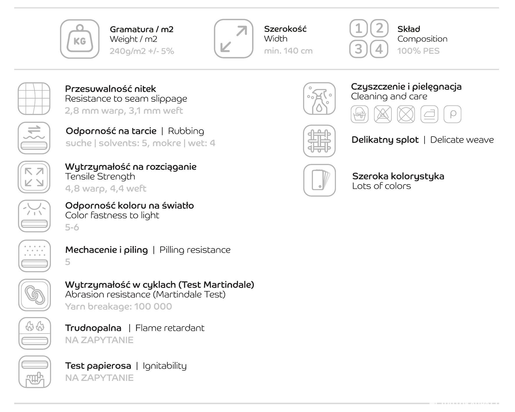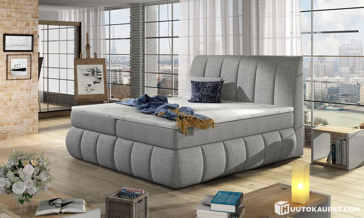 Se on verhoiltu kestävästä, 100 % polyesterikankaasta. Kangas on erittäin kulutuskestävä (100 000+ Martindale-sykliä) kangasnäyte (fabric card) liitetty, joten se sopii erinomaisesti sänkyyn, jossa mukavuus ja pitkäikäisyys ovat tärkeitä.