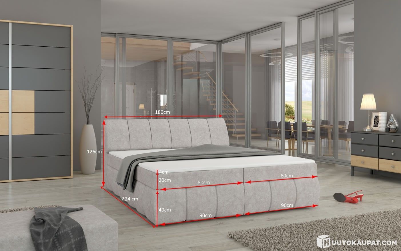 Ulkomitat: 200x224x126cm (sänky + patja + sijauspatja)