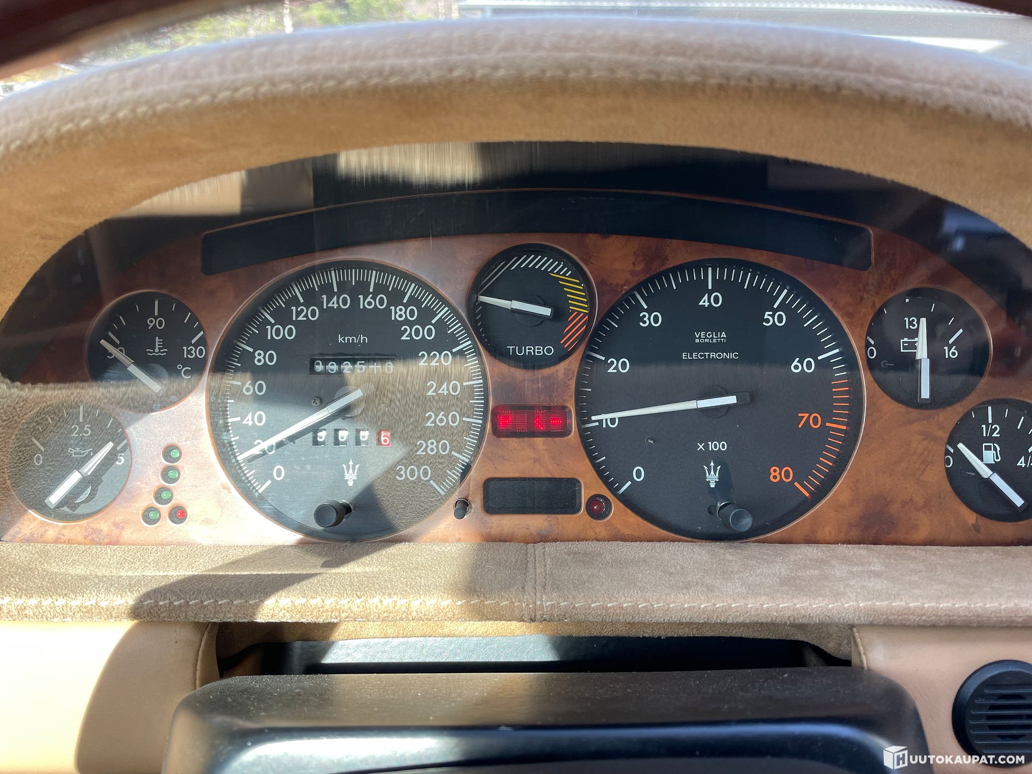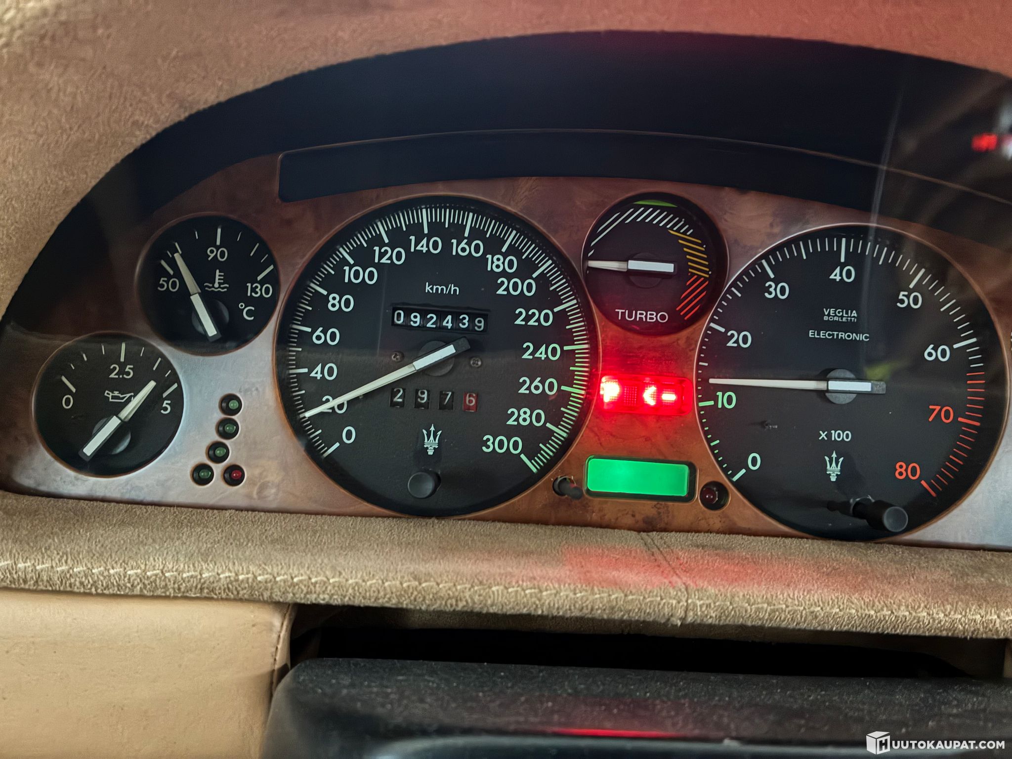 Tässä mallissa vielä harvinainen Maseratin soikea kello kojelaudassa.