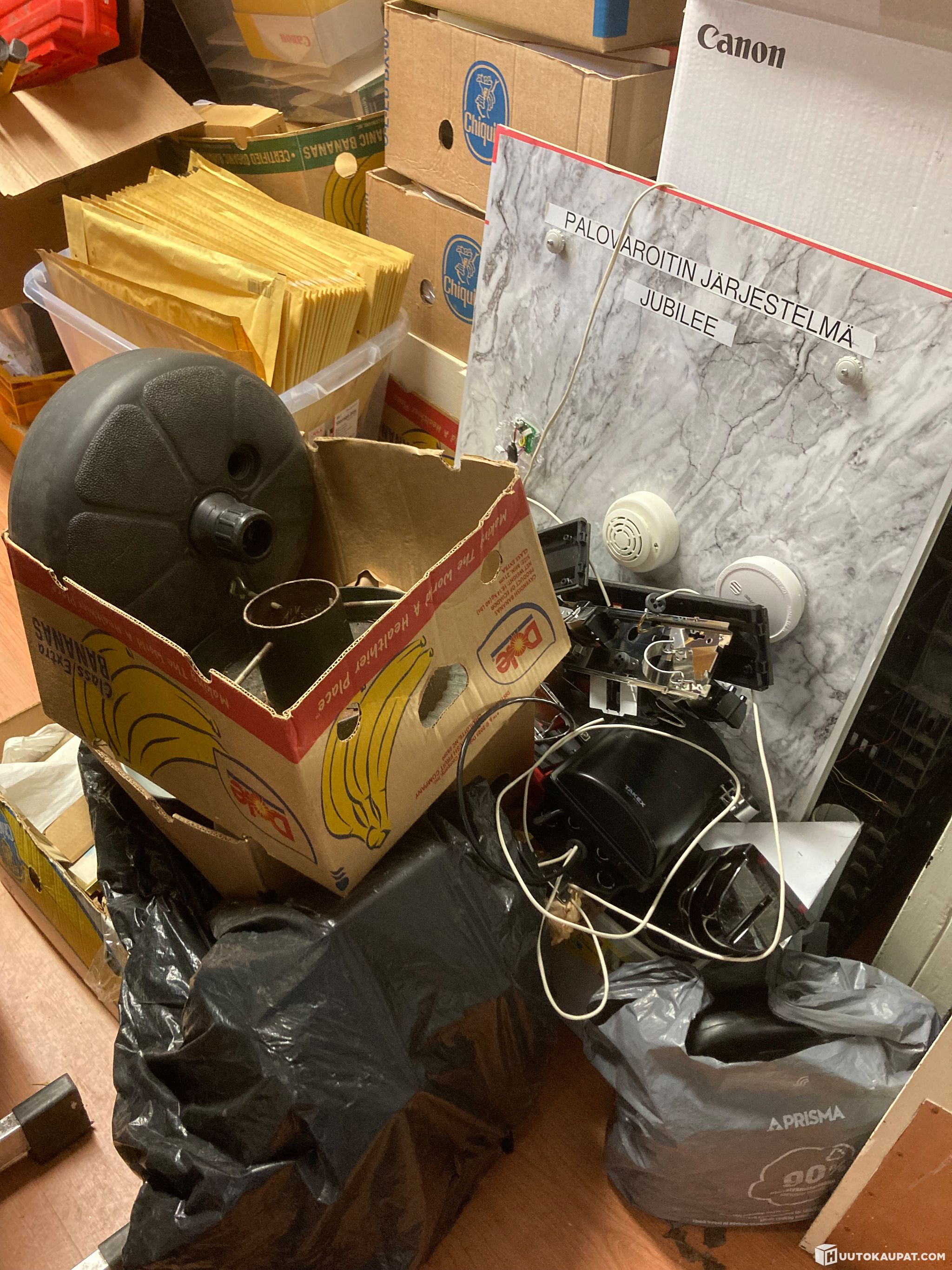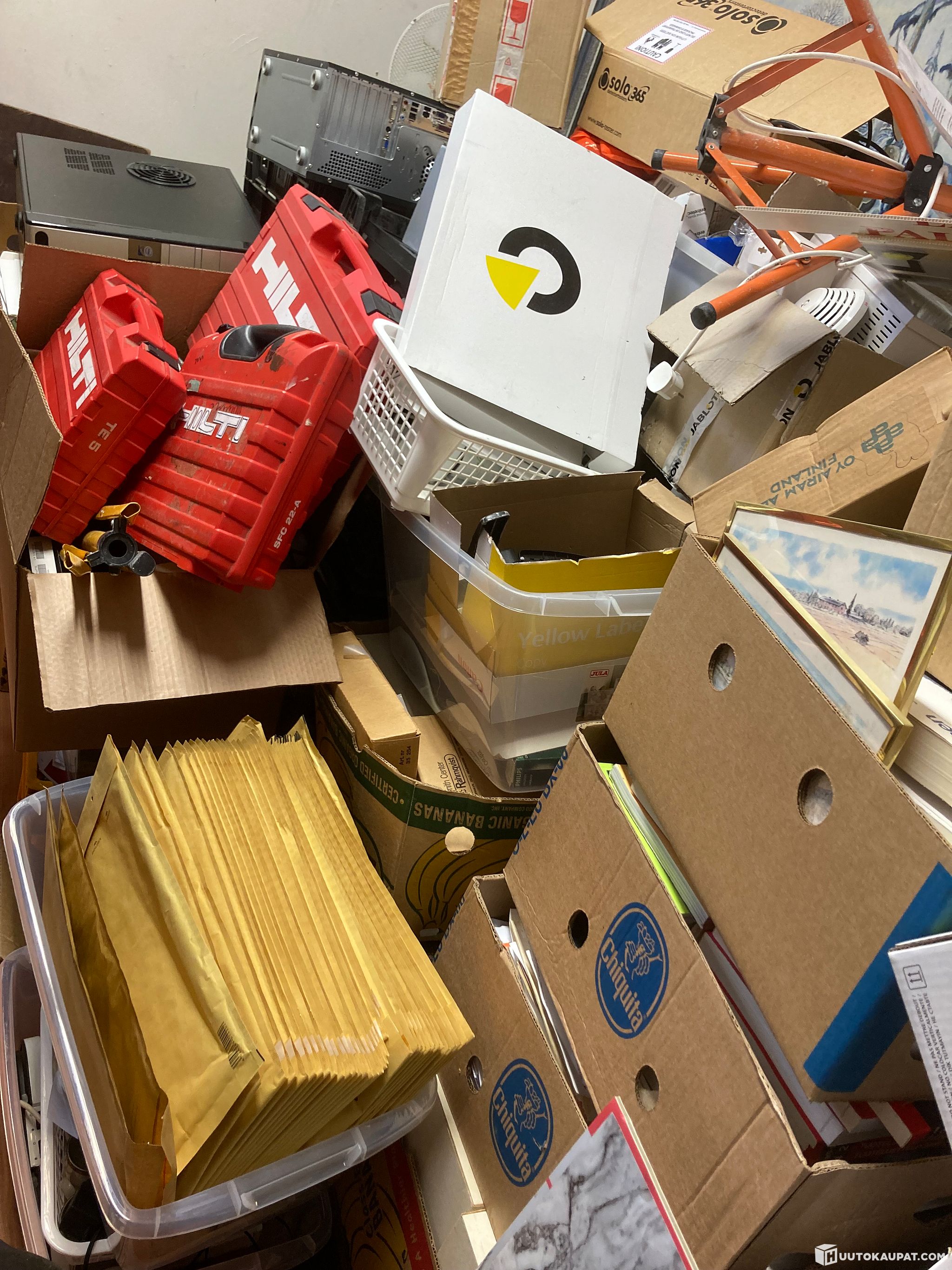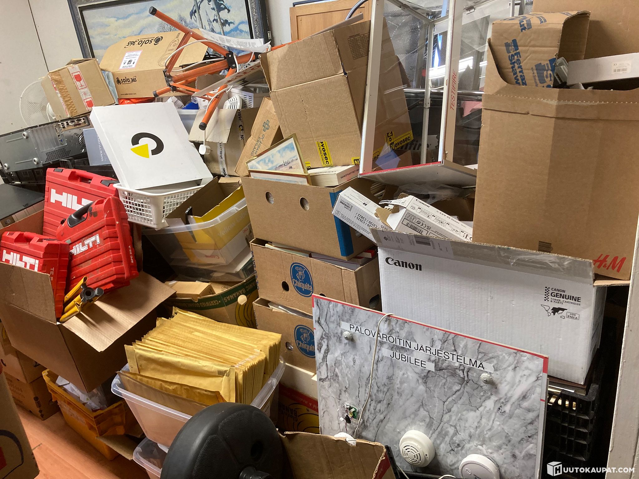 Sähköliikkeen loppuinventaariota. Kaikki kuvassa näkyvät laatikot ja muut lattialla olevat tavarat. Seinillä olevat tavarat eivät kuulu kokonaisuuteen. Hilti laatikot tyhjiä!! Nouto olisi hoidettava 10.4.2026 klo 16 mennessä! Löytöerä ei tutkittu kuin hieman päällisin puolin. Noin 2 kuutiota tavaraa.