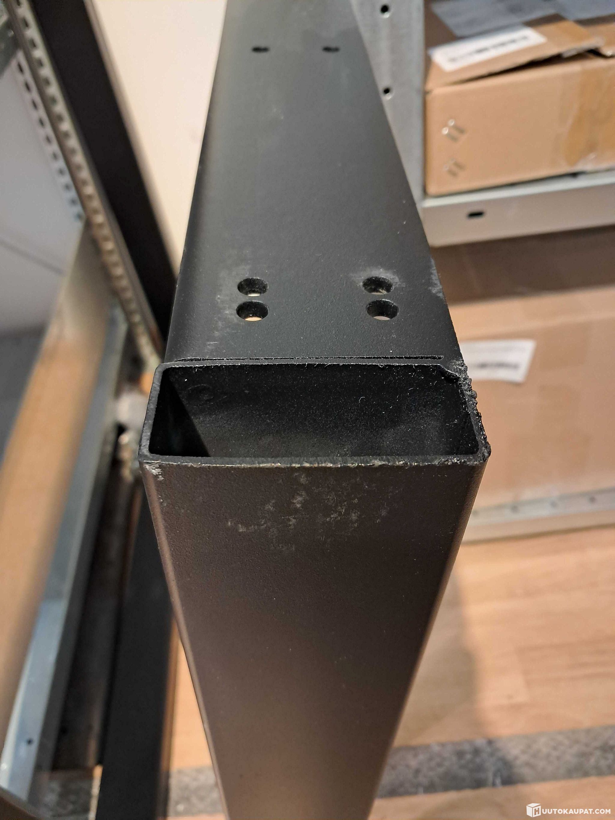 Kannessa jälki, katso kuva. Jalat kolhiintunut kuljetuksessa, katso kuvat. Käytönjälkiä ja likaa voi löytyä. Mukana toimitetaan tukilauta, jonka voi kiinnittää pöydän pohjaan.