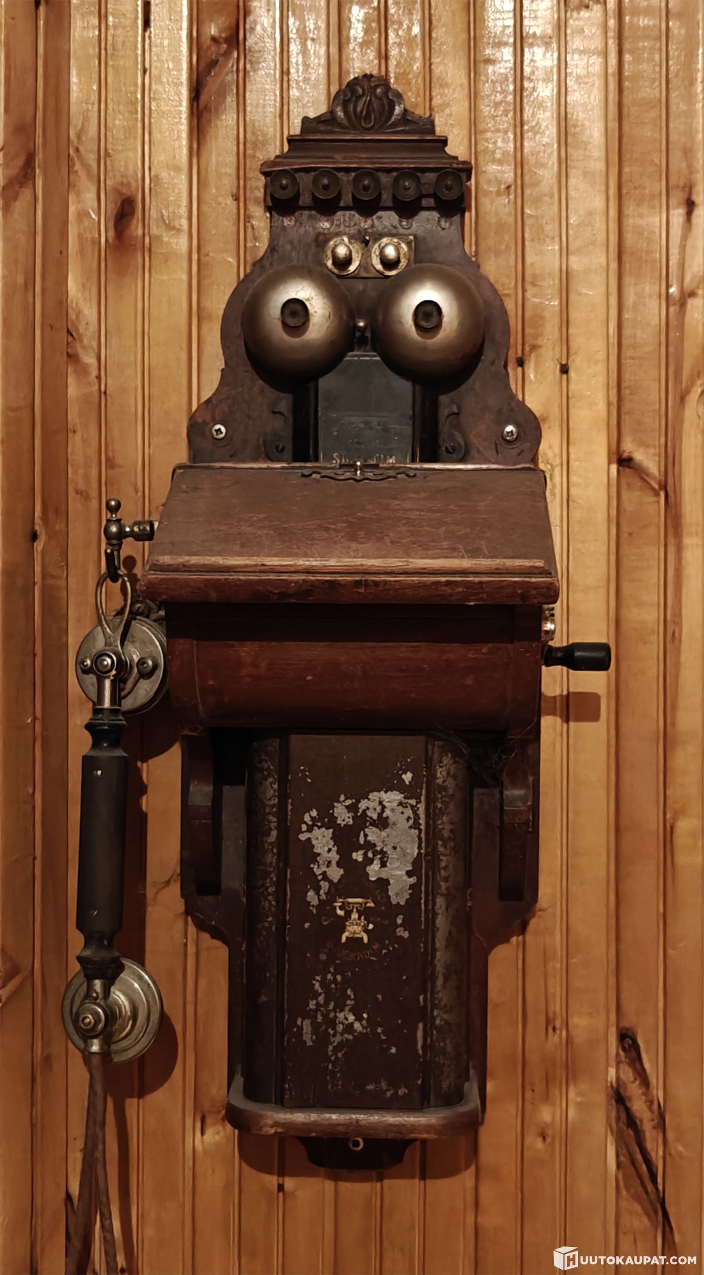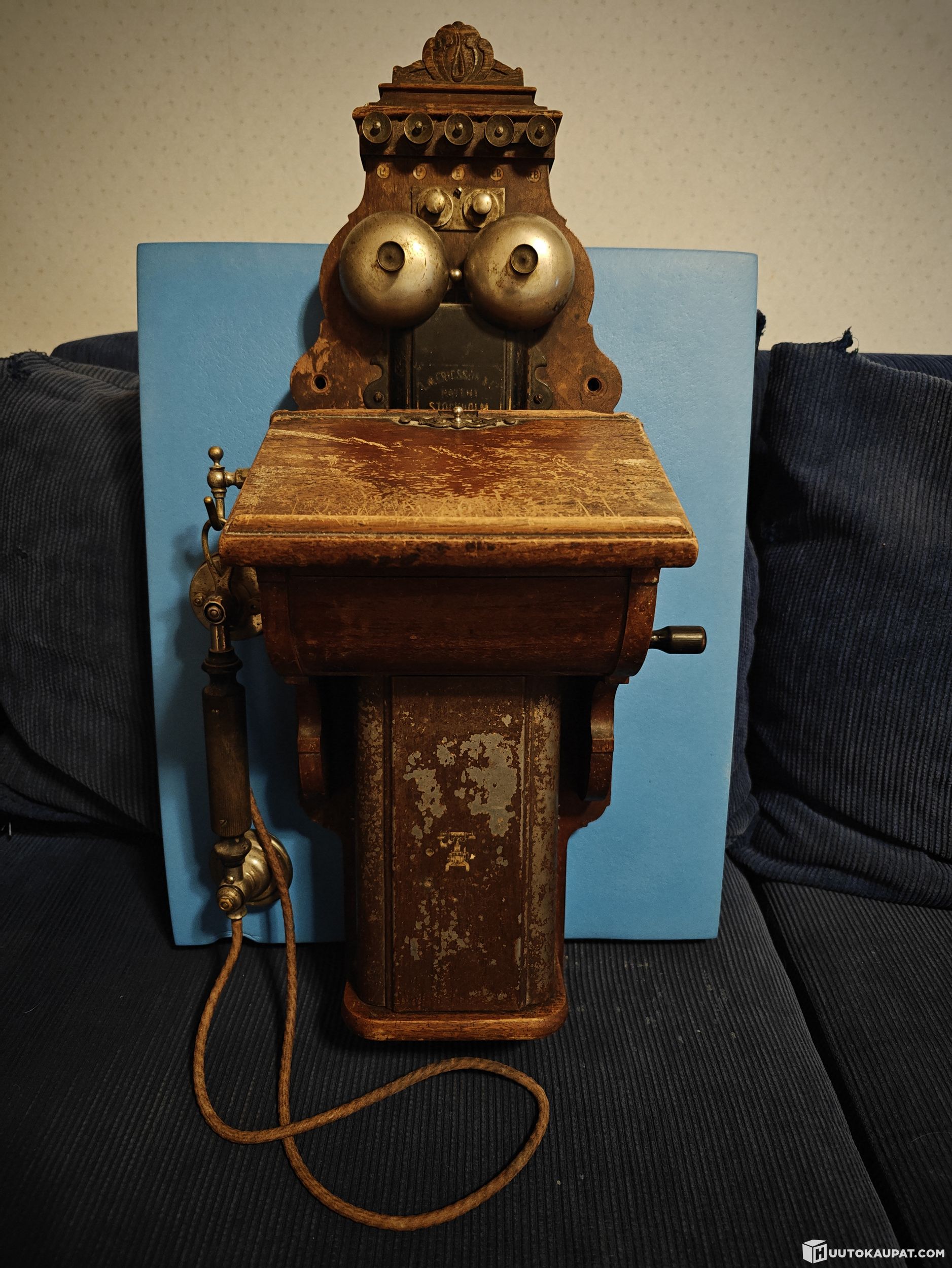 Myydään näyttävä ja aito L. M. Ericsson & Co, Stockholm -seinäpuhelin 1900-luvun alusta (arviolta 1895–1911).
