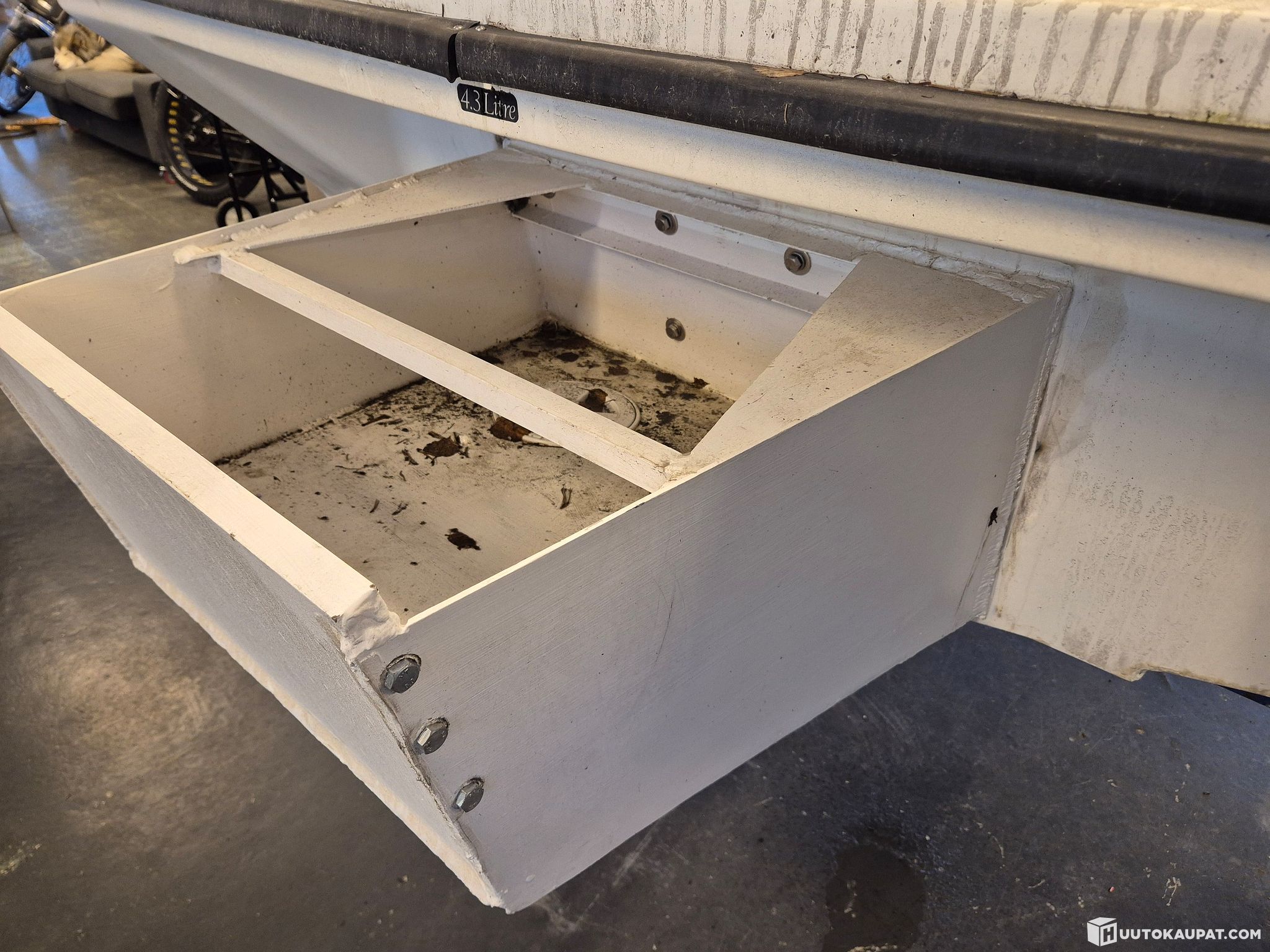 Gelcoat pohja hyvässä kunnossa. Perälautaan pultattu "bracketti" perämoottorille.