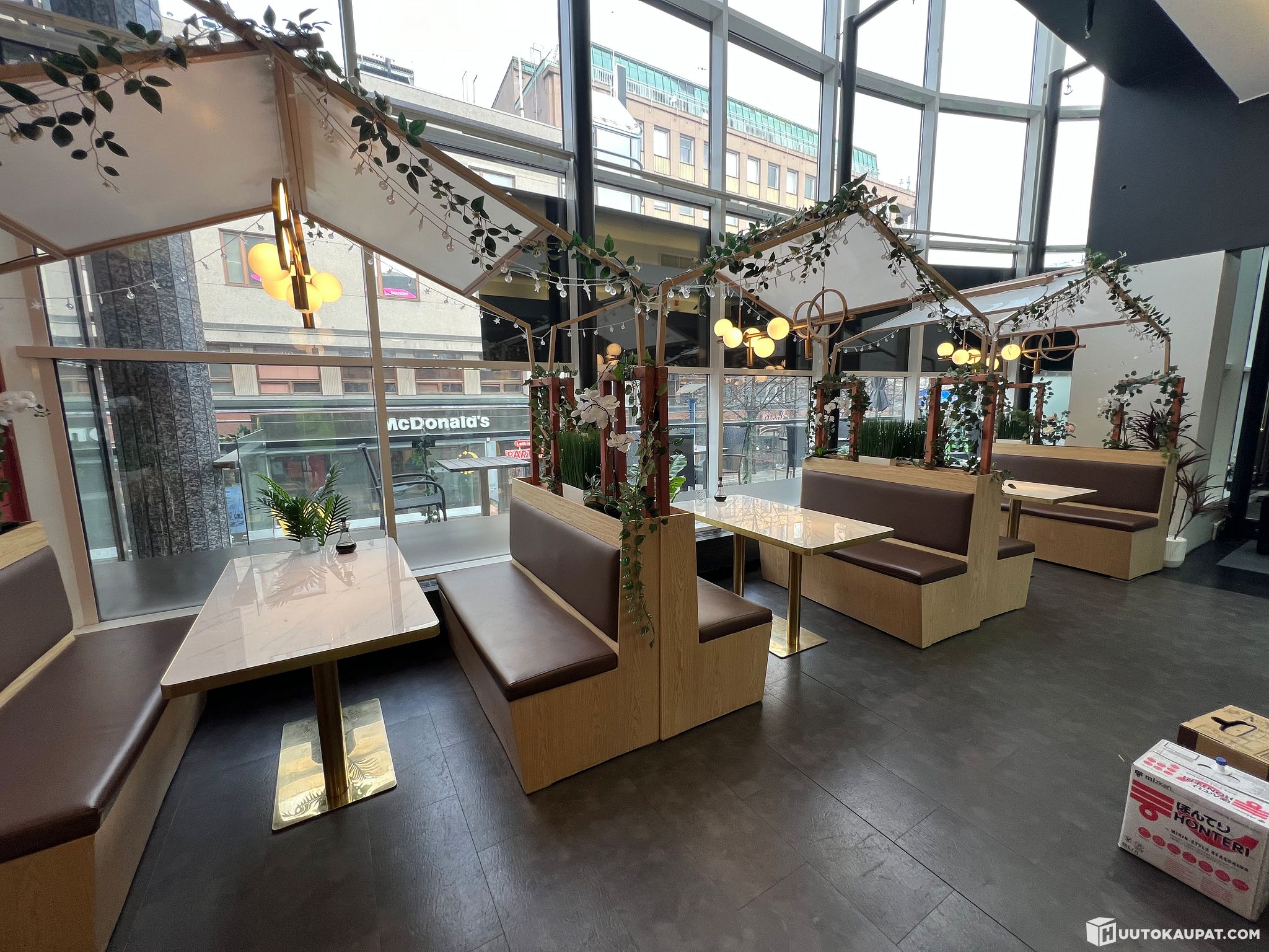 Sisältää penkit, pöydät, katot, koristeet, valot