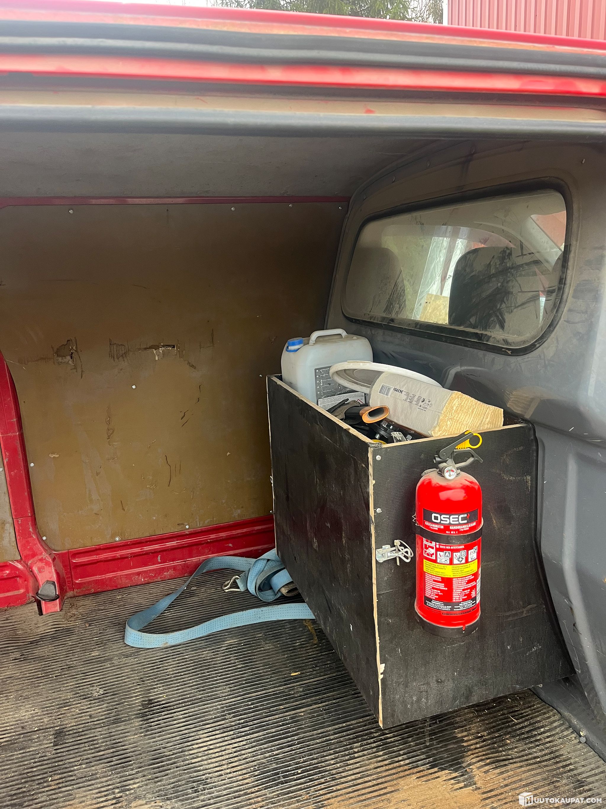 Sisustassa kuskin penkki revennyt vakio paikasta. Apukuskin penkki siisti kuntoinen. Molemmissa lämmitykset. Oviin tehty kaiutin paikat hiukan ronskilla tyylillä. Takakontissa kumimatto. Takakontin ovista vaneroinnit karissut matkalle ajansaatossa. Väliseinään tehty kotelo josta alaosa ohjaamoon päin ja päällä lokero kontin puolella. Kuvissa näkyvä irtaimisto ei kuulu kauppaan. Lokeron alla kuitenkin tilaa koko kontin pituudelta.