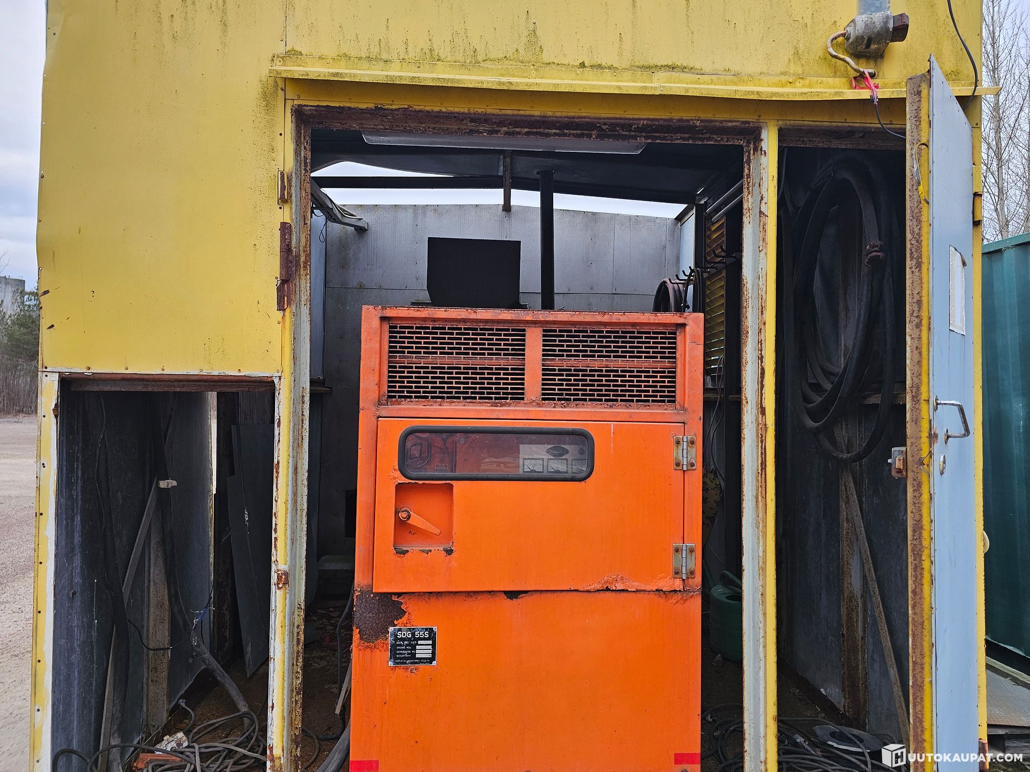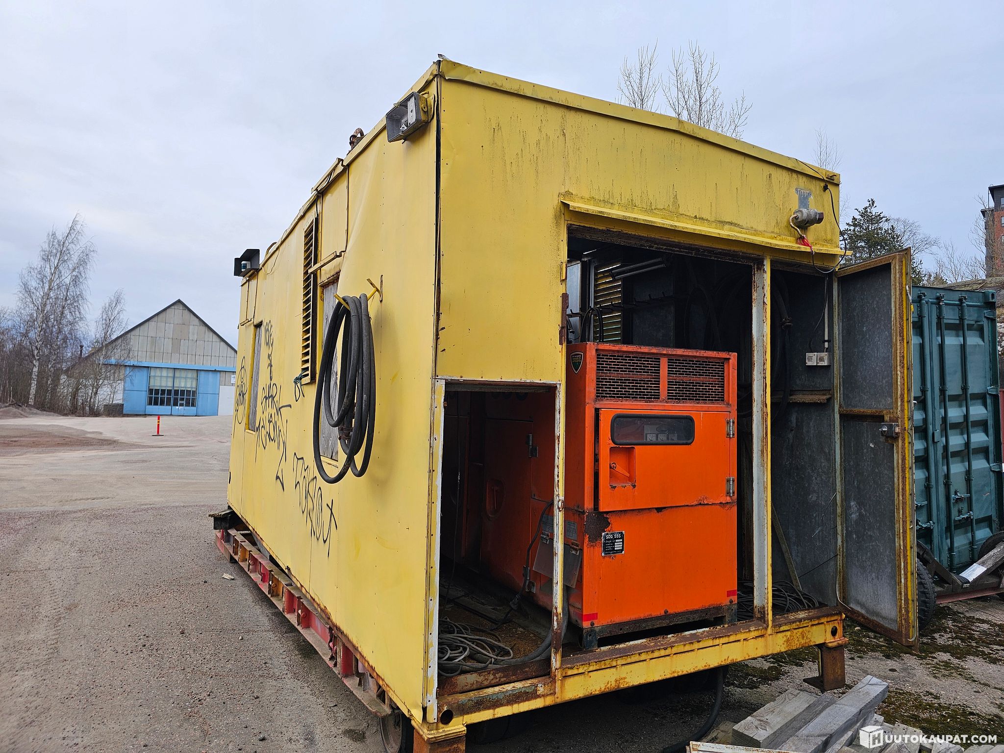 Generaattoripajakontti. Mitsubishi generaattori käynyt ja tehnyt sähköä viimeksi ~2019. Pituus 6m leveys 2,45m.