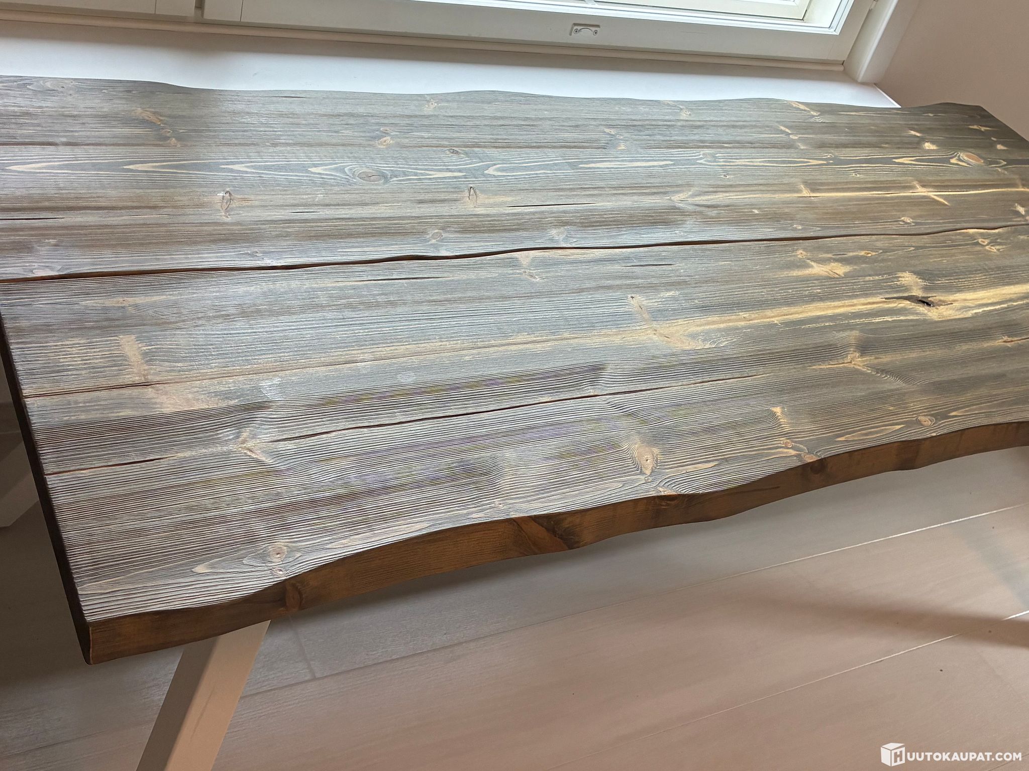 Pöydän keskellä näkyy kuvissa oksa / luonnollinen puun kohta. Sen voi nähdä pienenä kosmeettisena yksityiskohtana, mutta käytännössä se on osa puun luonnollista rakennetta ja tekee pöydästä yksilöllisen.