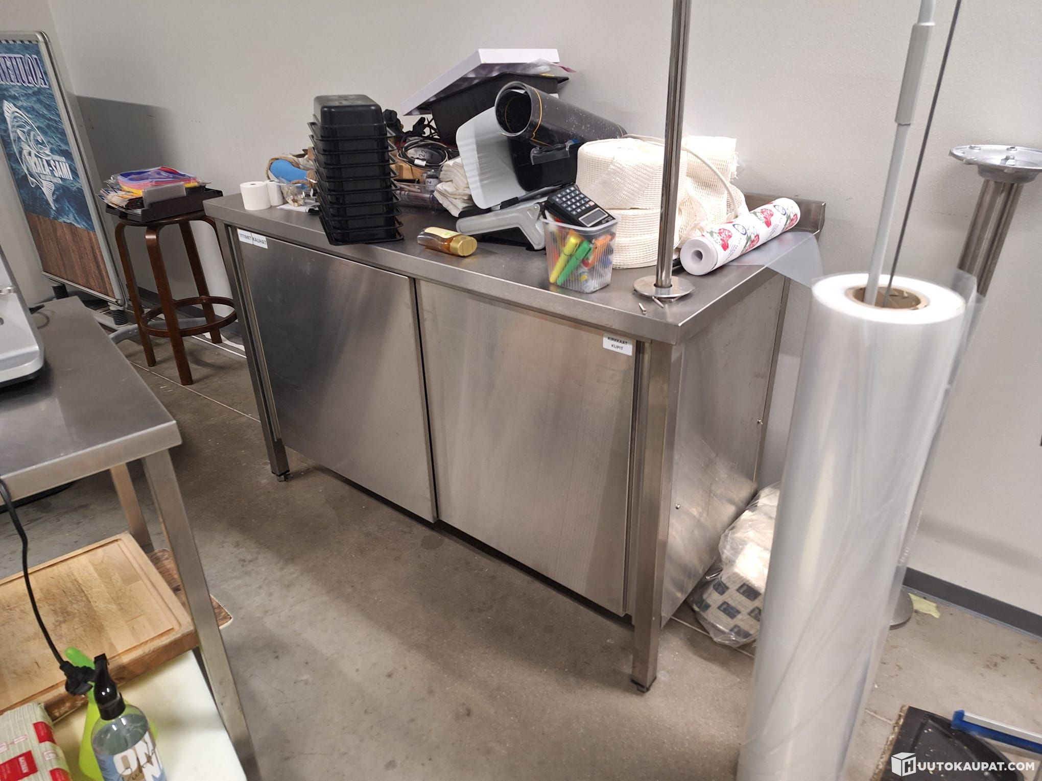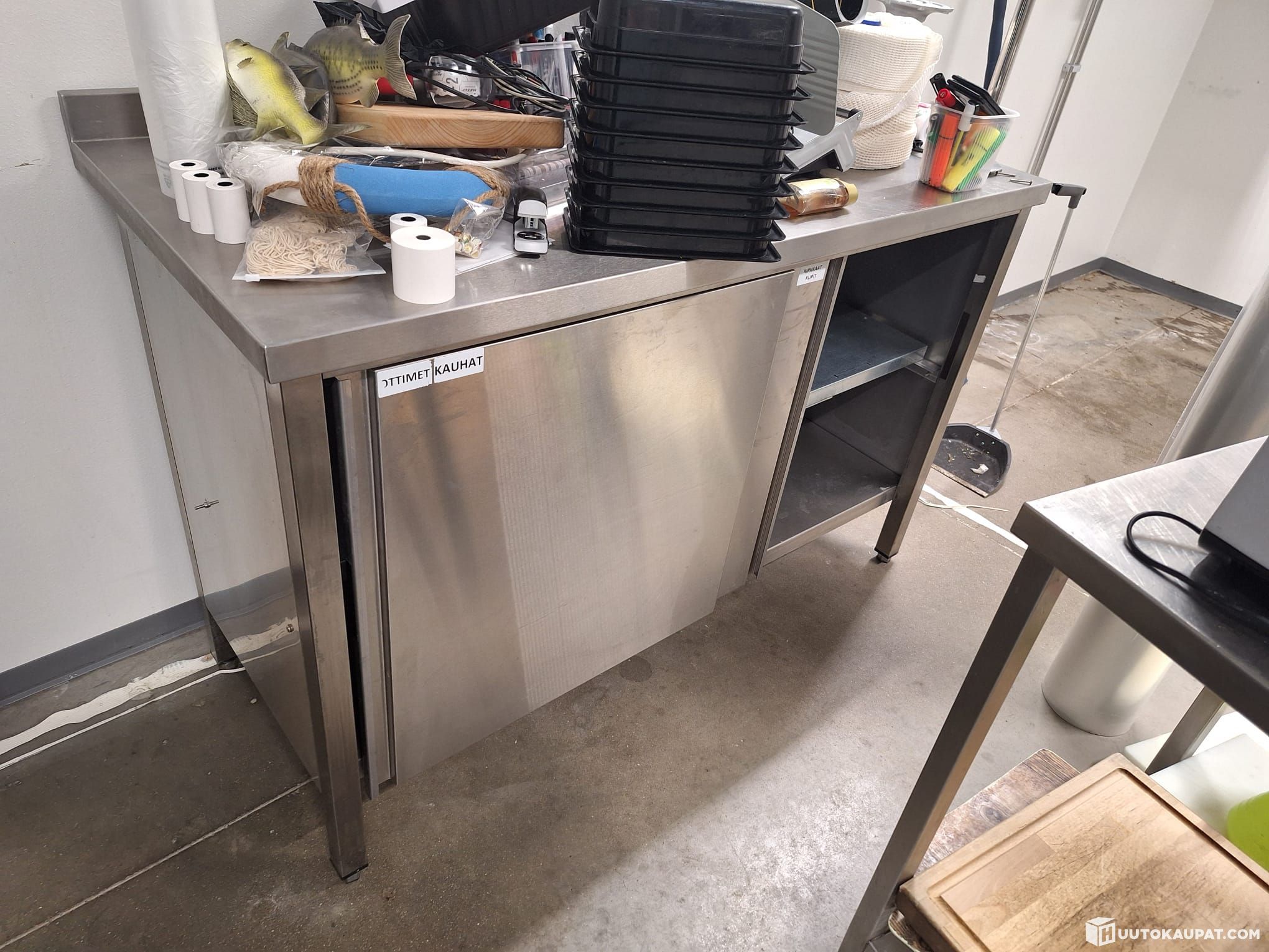 Ruostumattomasta teräksestä valmistettu työpöytä. Pöydässä on kaksi kaappia saranaovin, mikä tarjoaa säilytystilaa. Siinä on myös säädettävät jalat vakauden varmistamiseksi.