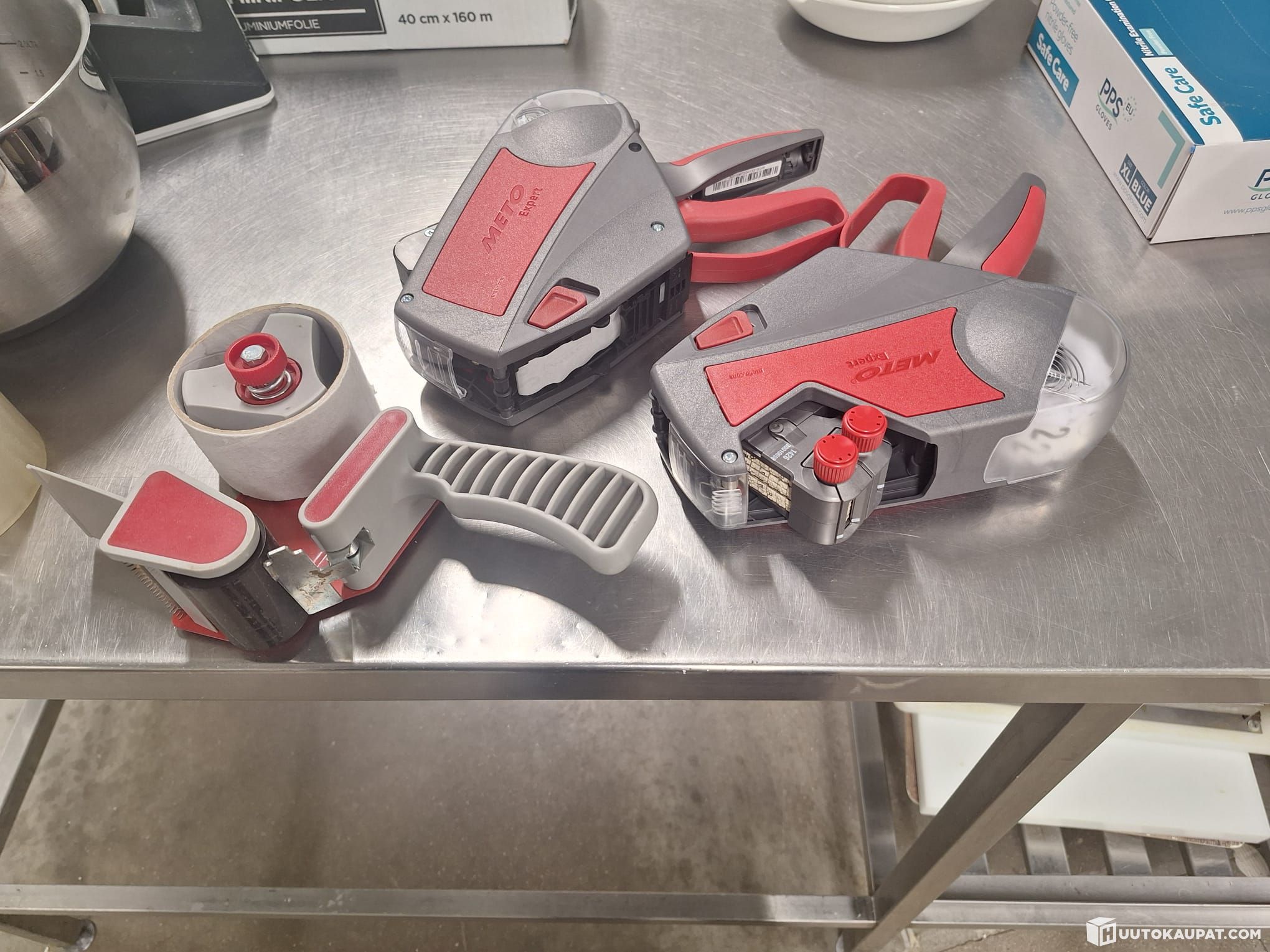 Kaksi Meto Expert -sarjan hinnoittelulaitetta (oikealla) ja yksi pakkausteipin katkoja (vasemmalla). Näitä käytetään hinta- tai päivämäärätarrojen tulostamiseen ja kiinnittämiseen.