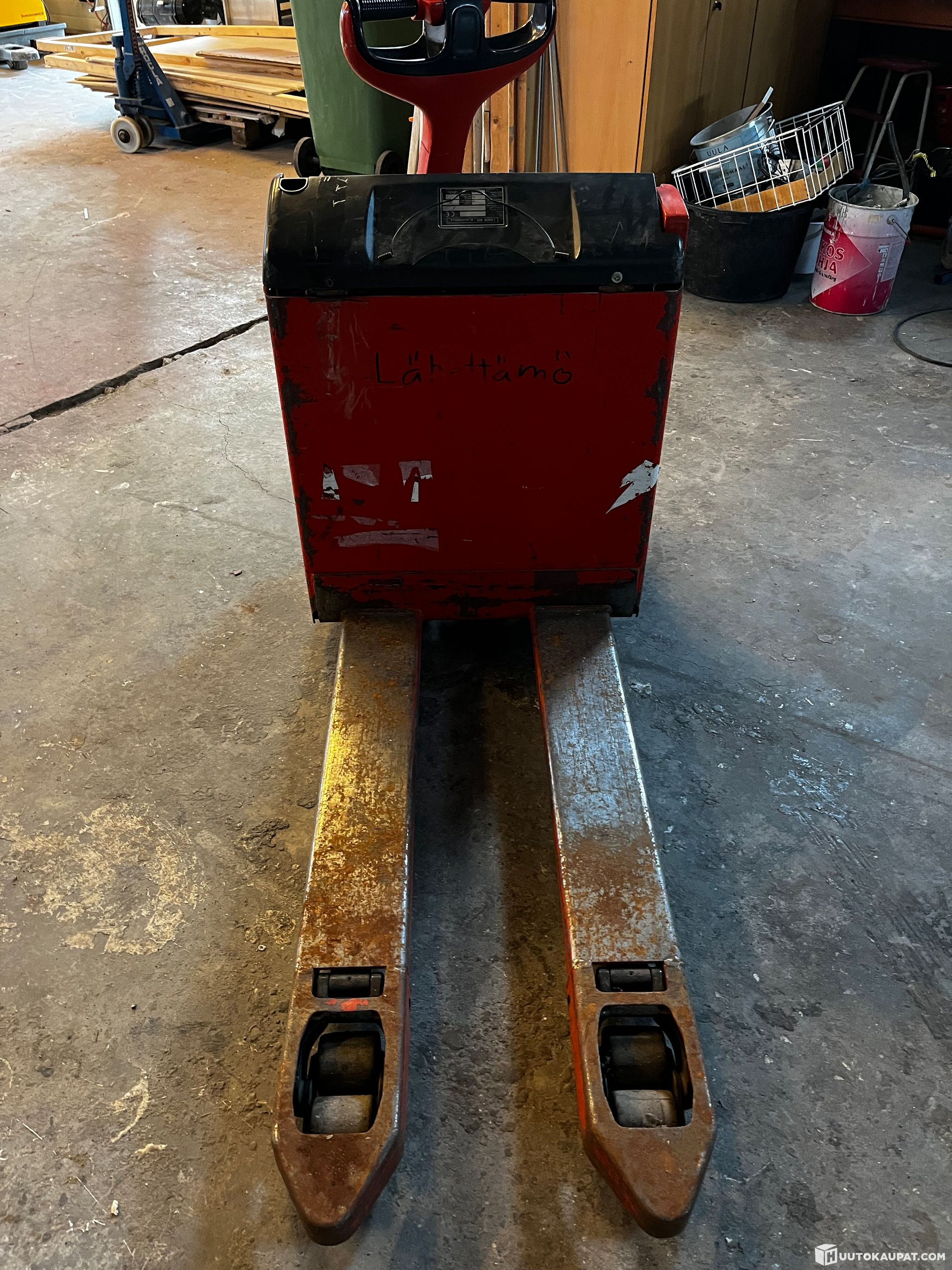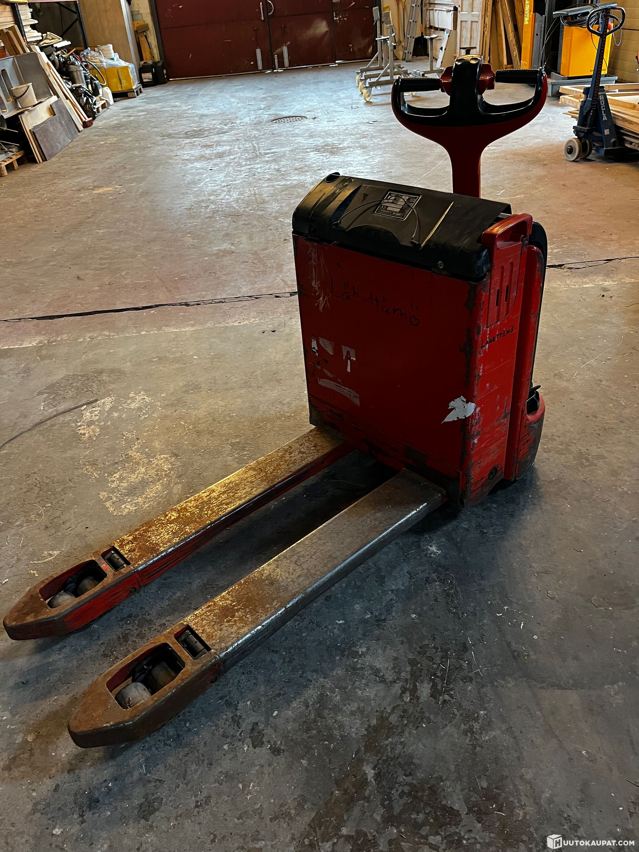 Sähkökäyttöinen Linde lavatrukki ylimääräisenä pois nurkista.