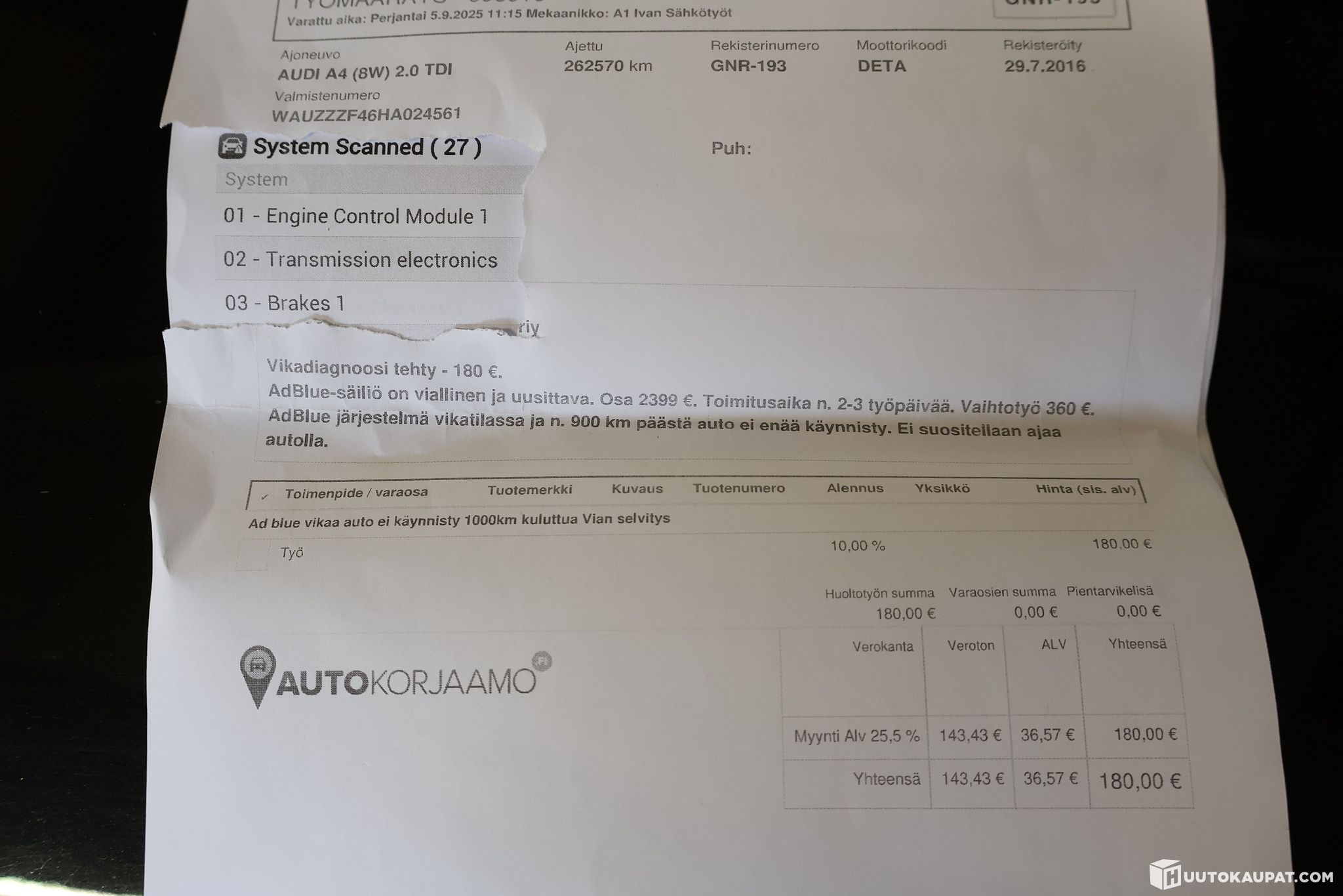 Kohteessa on havaittu muutoksia moottorin ohjelmoinnissa tai pakokaasujärjestelmissä, minkä vuoksi se ei ole liikennekelpoinen. Ostaja vastaa ajoneuvon korjaamisesta tieliikennekelpoiseksi omalla kustannuksellaan. Täsmennys: AdBlue koodattu pois käytöstä.