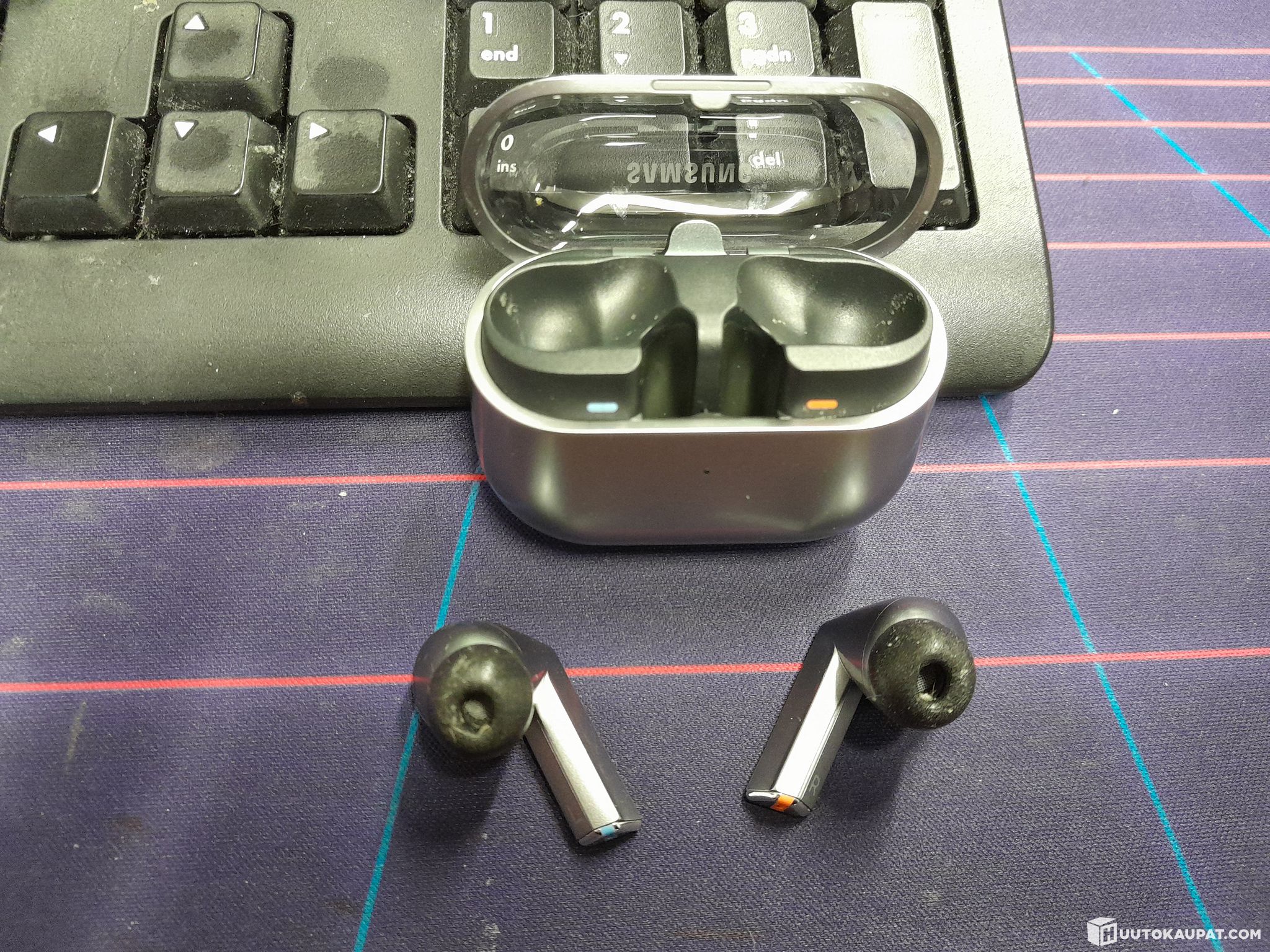 Käytetyt, mukana napit, latauskotelo ja laturi.
