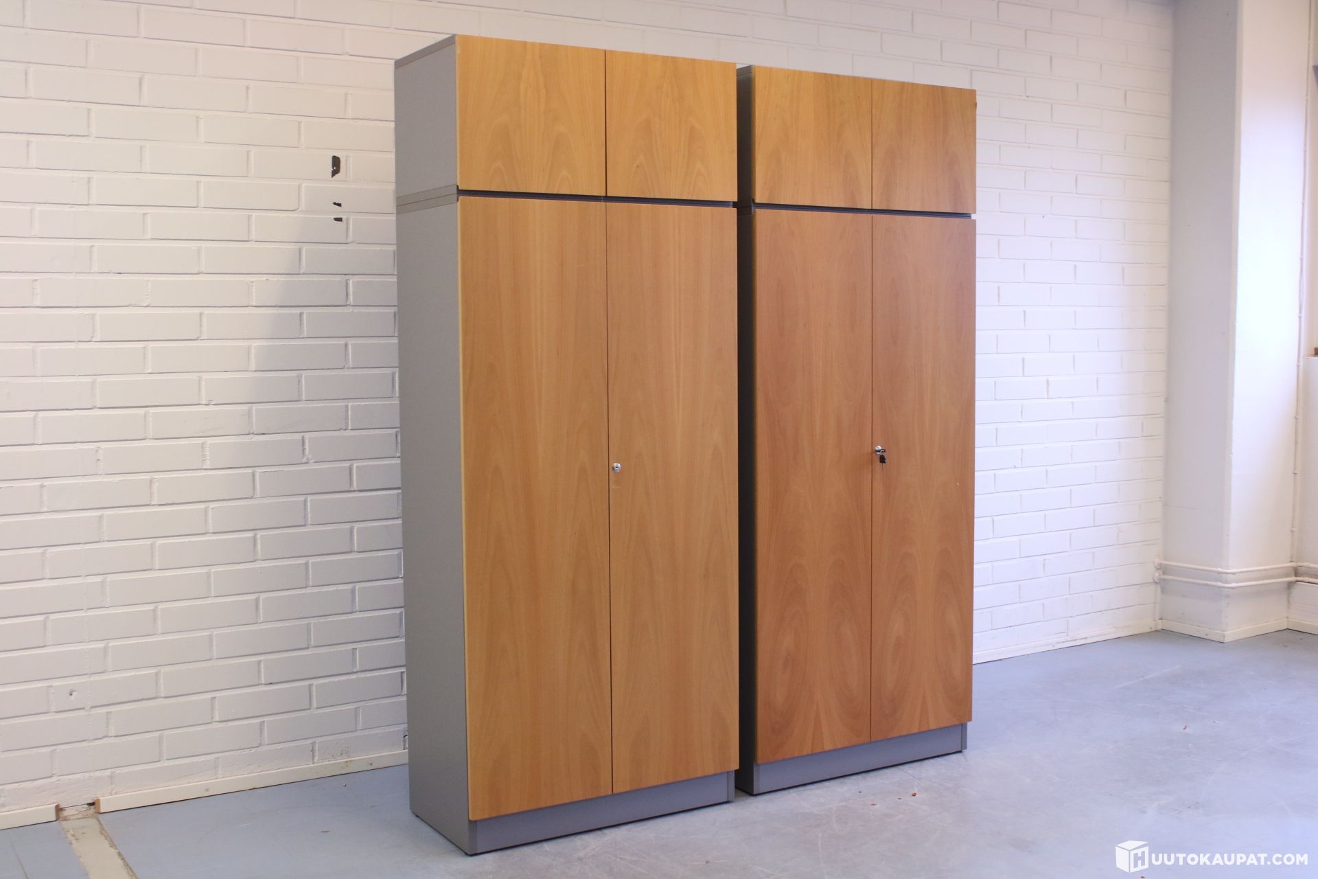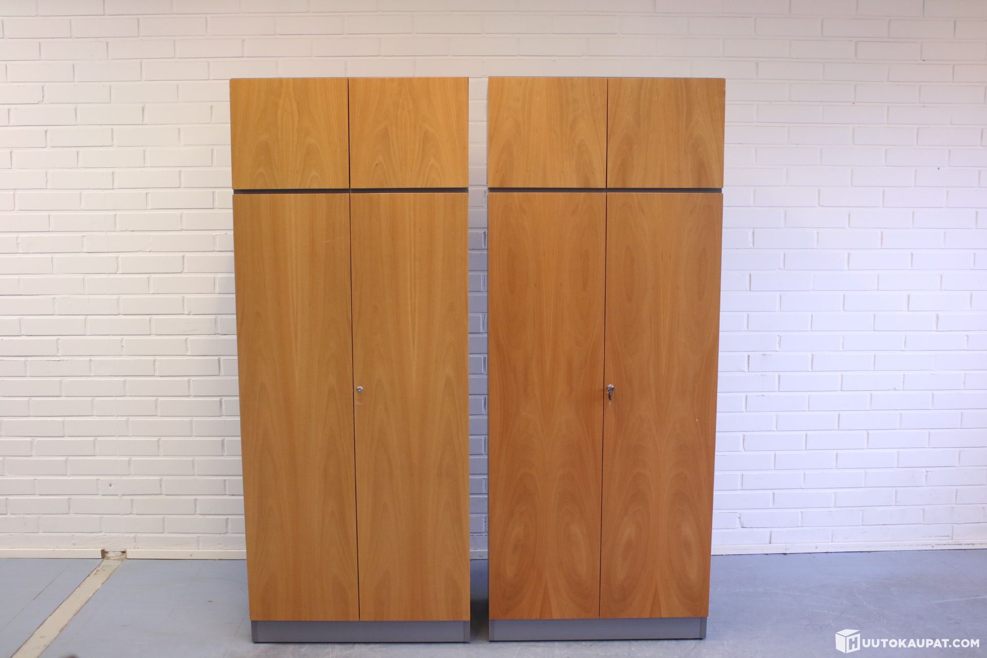 Kaksi kappaletta tyylikkäitä Adi kalusteet Oyn lukollisia korkea kaappeja.