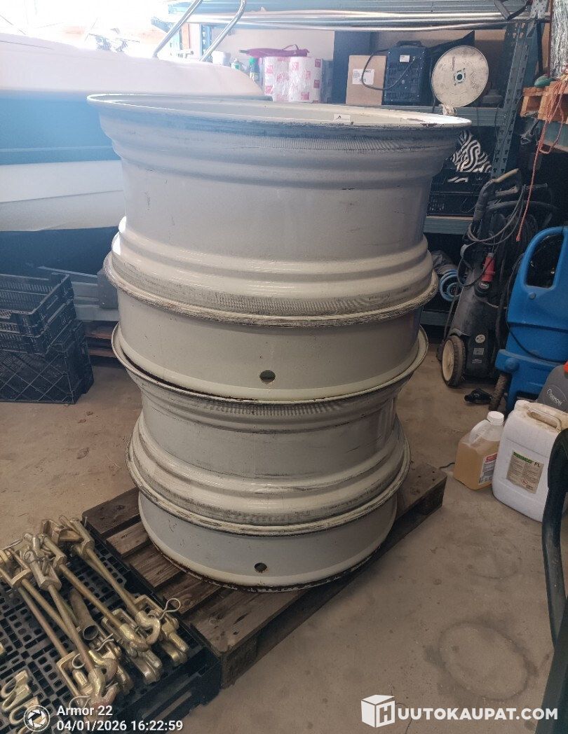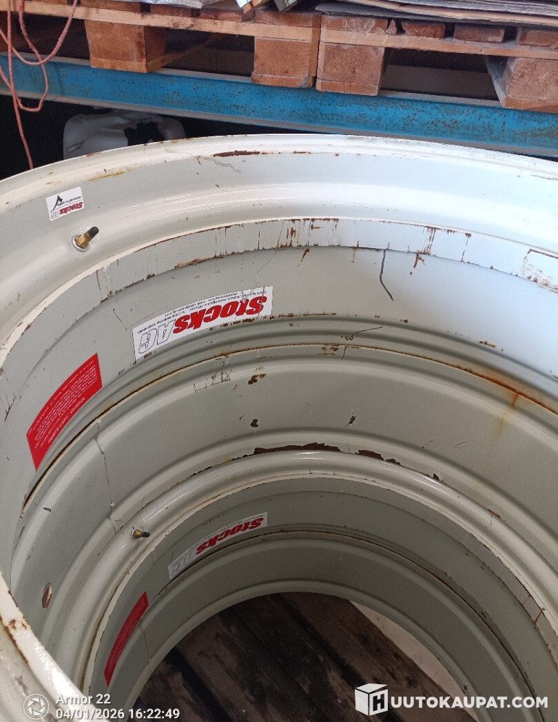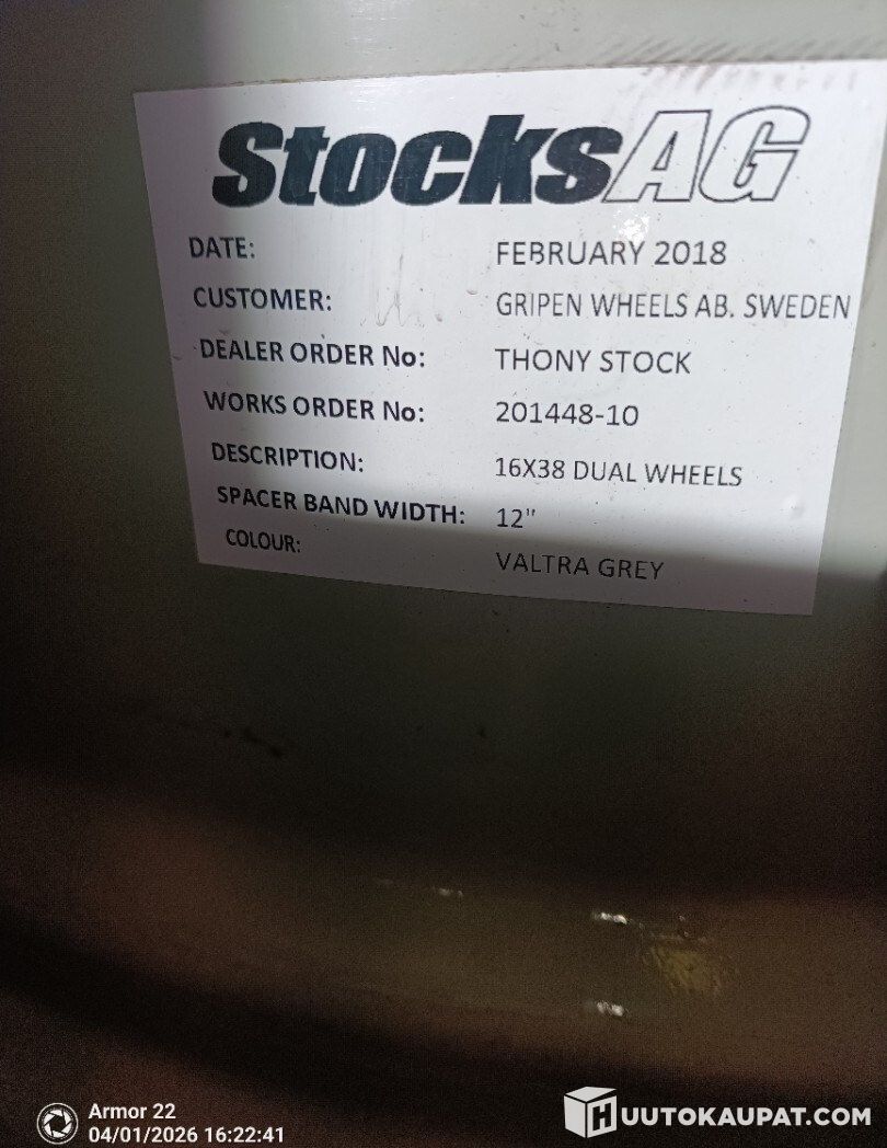 Hyväkuntoinen 16" x 38" liukukisko paripyörä vanteisto kiinteillä pohjaamattomilla välivanteilla ja pikalukoilla. Laadullisesti vähintäänkin Rajun vastaavien veroiset. Ollut 520/85-38 , voi olla ainakin 520/70-38 tai 460/85-38