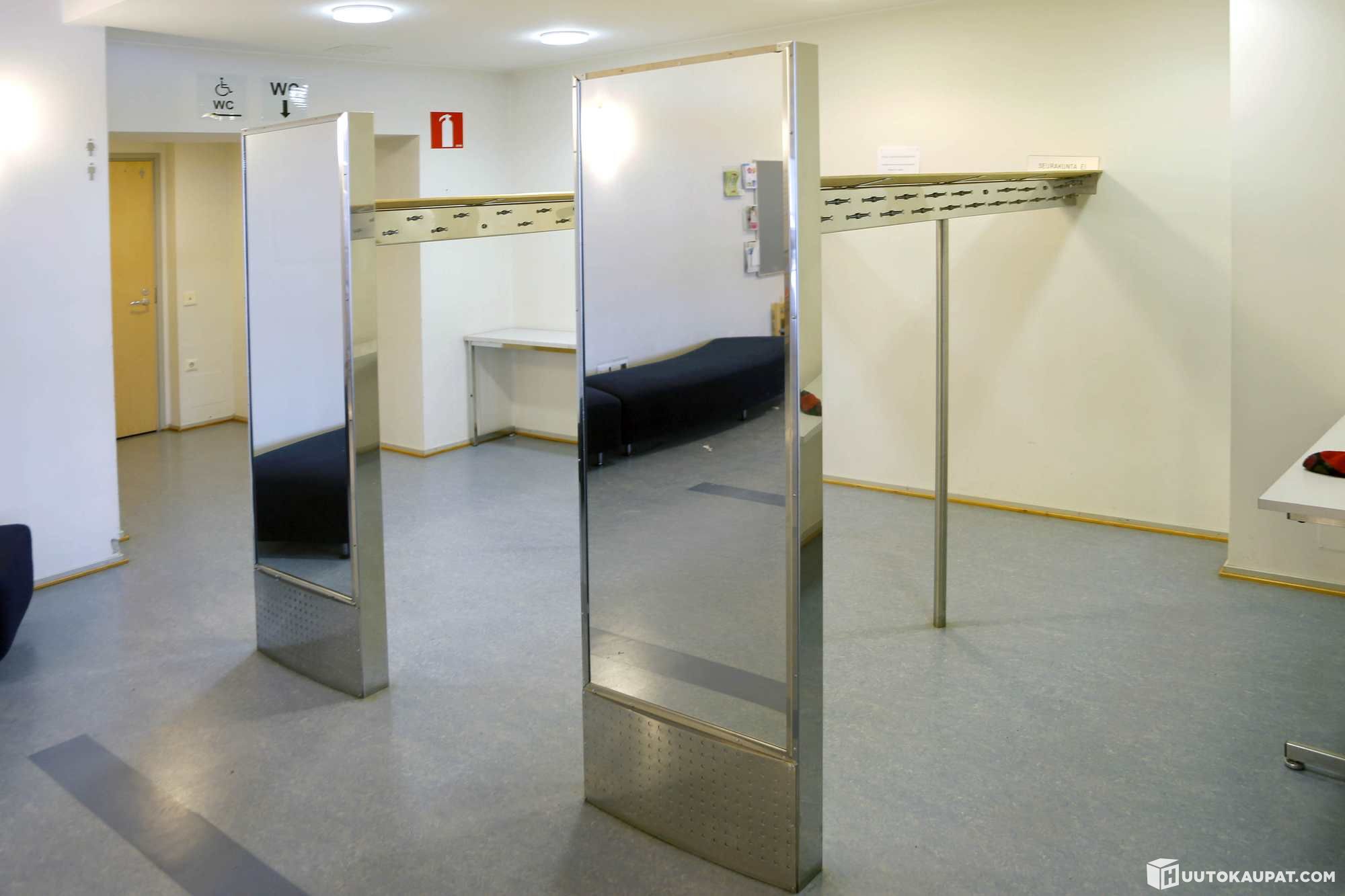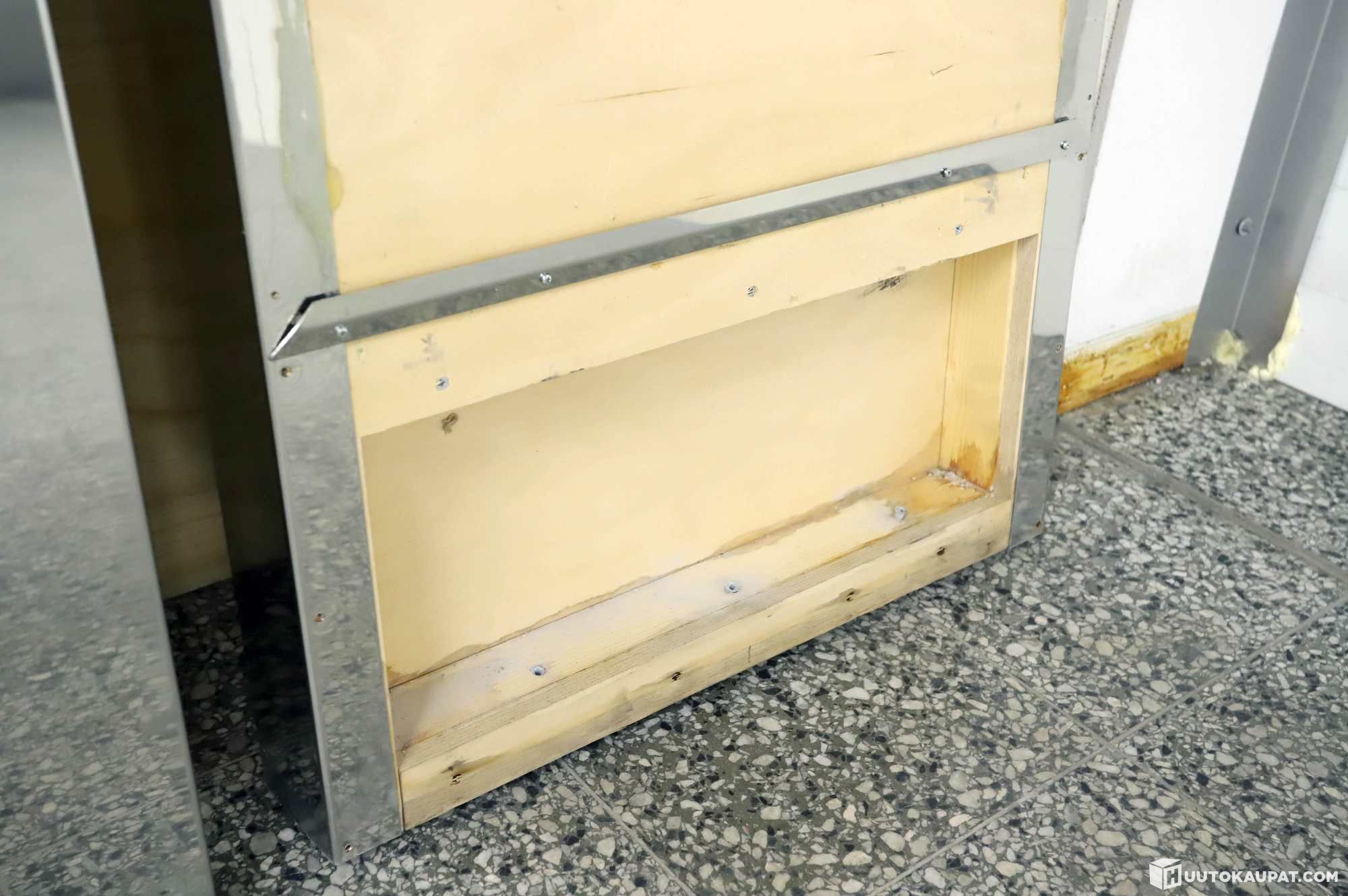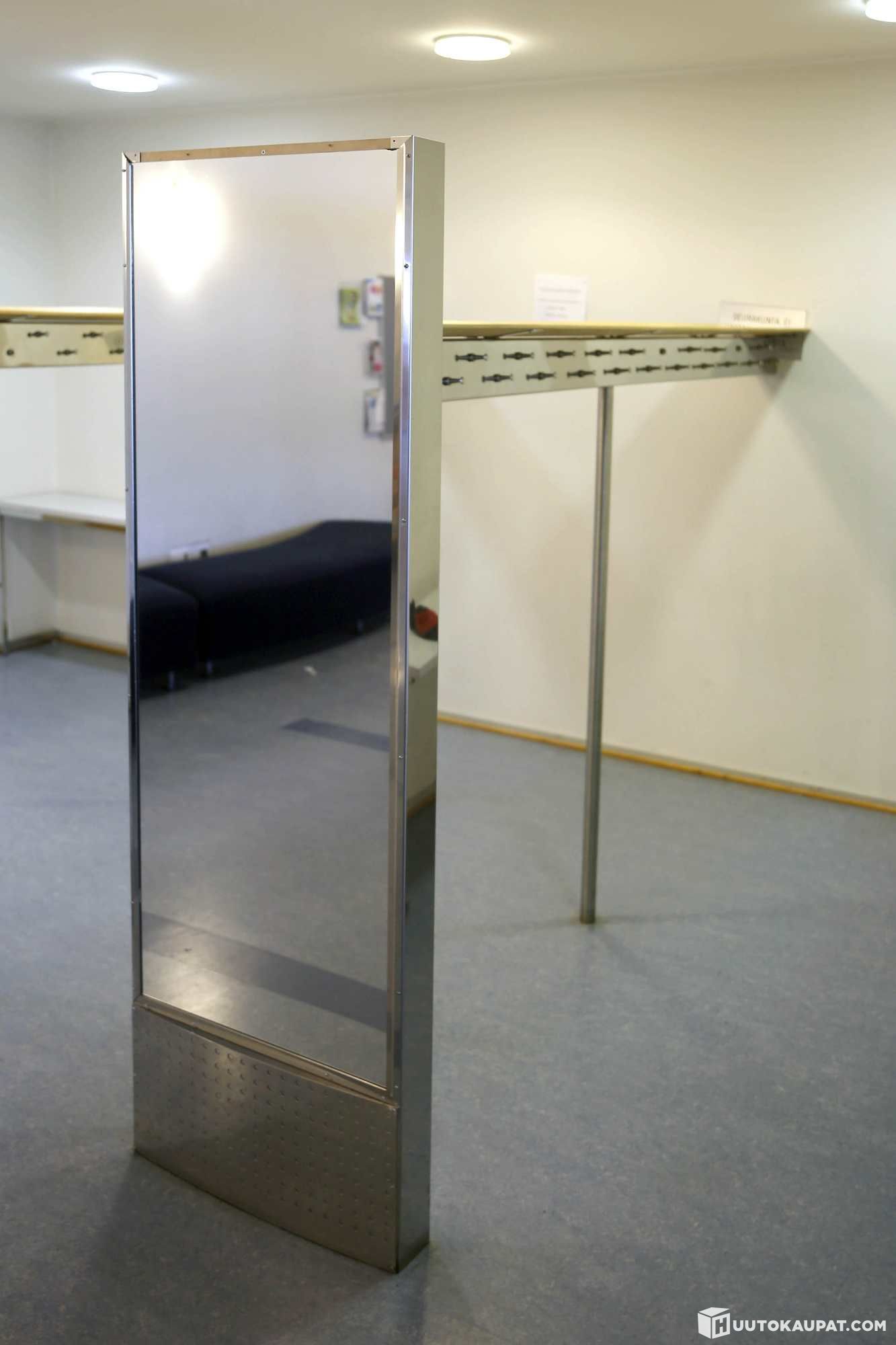 Toisesta päädystä puuttuu peili, naulakoista puuttuu "tappeja", joihin takit ripustetaan.
