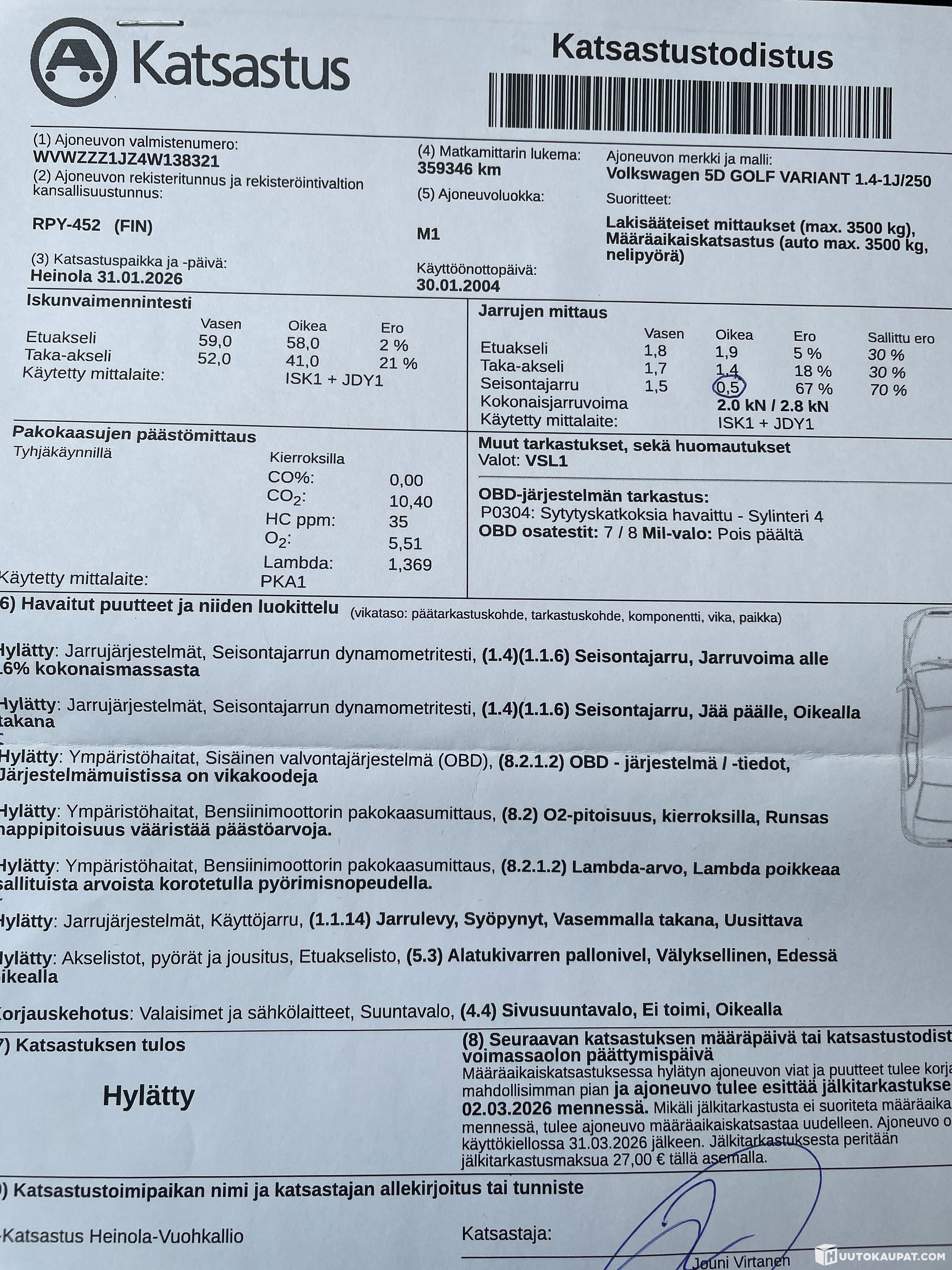 Viimeisessä kuvassa olevan vikalistan kaikki muut kohdat korjattu; pallonivel ja jarrulevyt vaihdettu. Ei tieliikennekelpoinen koska katsastus ummessa.