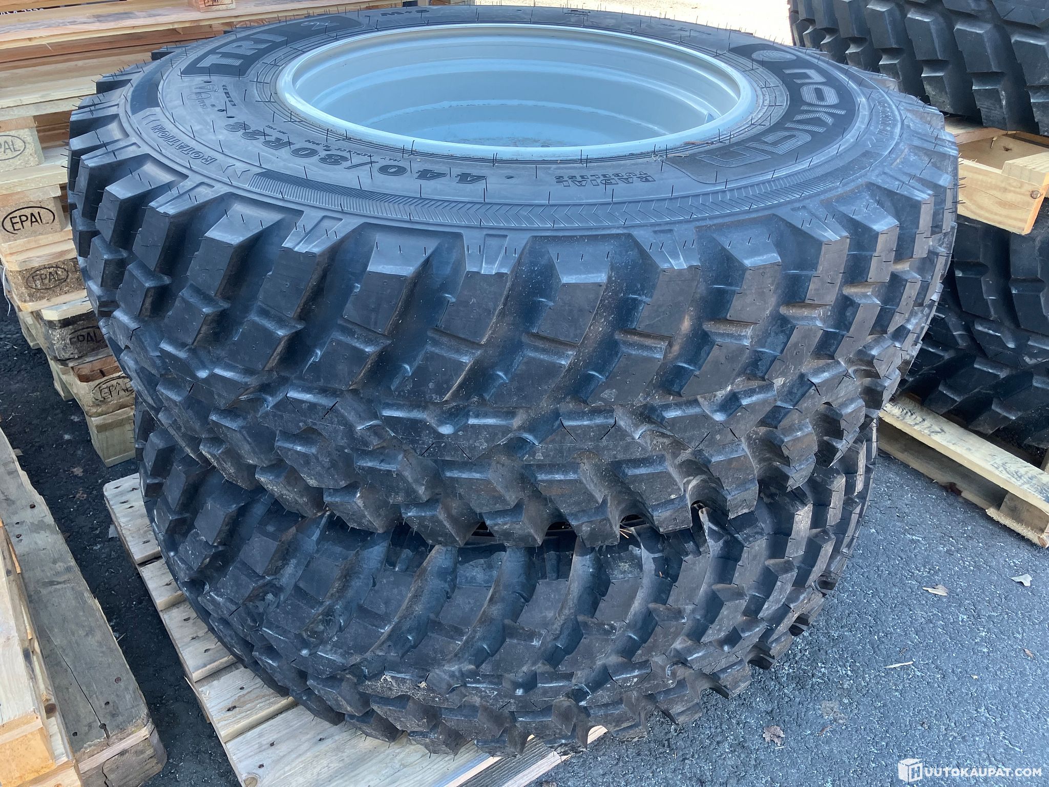 Siirtoajettu Nokia TRI2 540/80R38 + 440/80R28 Rengasvannepaketti Valtran alkuperäisillä vanteilla T5 alta, 10-pulttinen etuvanne. Vannekoot 18x38 ja 15x28. Sijaitsee Savonlinnan pisteellä.