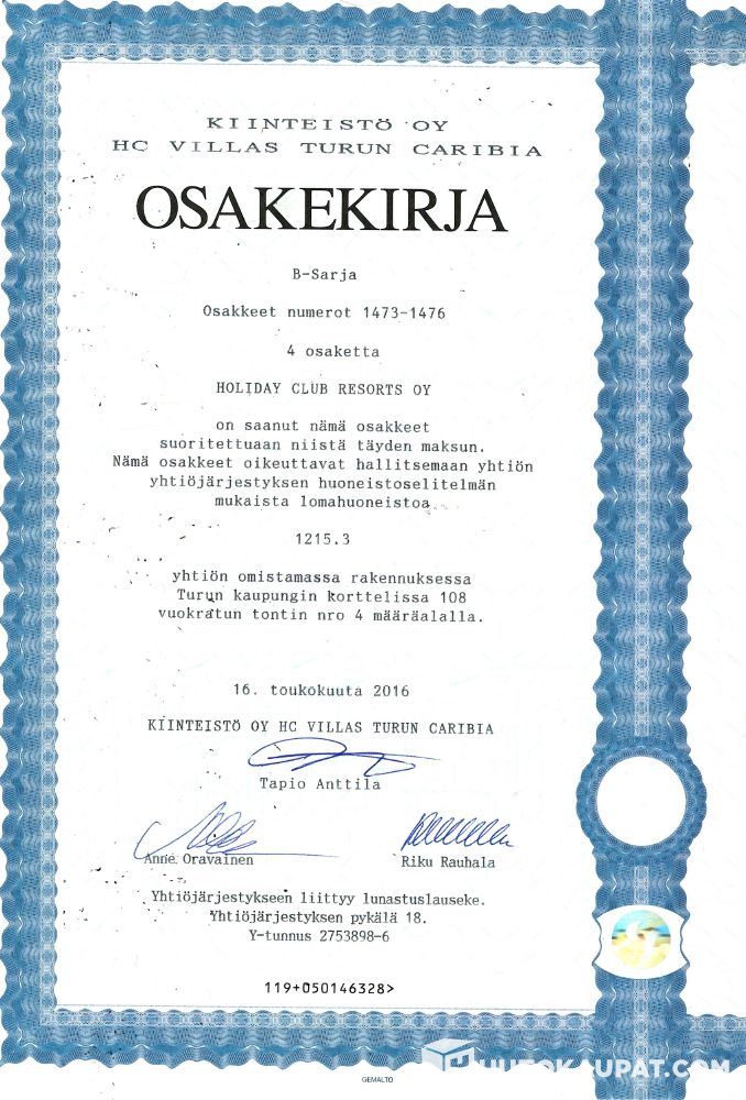 Myydään villas-omistus Koy HC Villas Turun Caribia - yhtiöstä. Huoneisto 1215.3, osakenro 1473-1476. Tänä vuonna mahdollisia käytettäviä viikkoja on vielä 23, 29, 35, 41 ja 47 (alkuvuoden viikot vuonna 2026 olivat 5, 11 ja 17). Vuonna 2027 käyttöviikot ovat: 1, 7, 13, 19, 25, 31, 37, 43 ja 49.