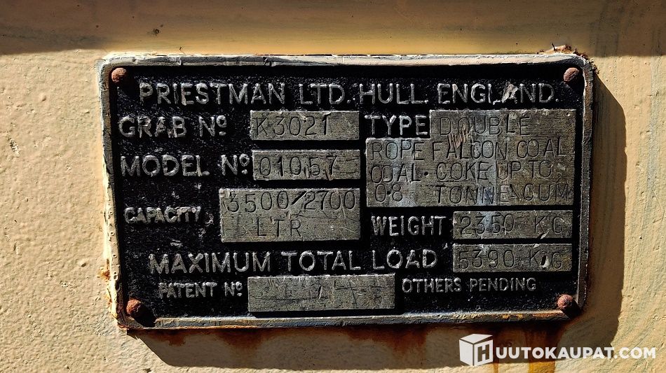 Priestman kauha, 2 vinssillä käytettävä. Tilavuus 2700 / 3500 litraa, omapaino 2750 kg, kokonaispaino 5390 kg.