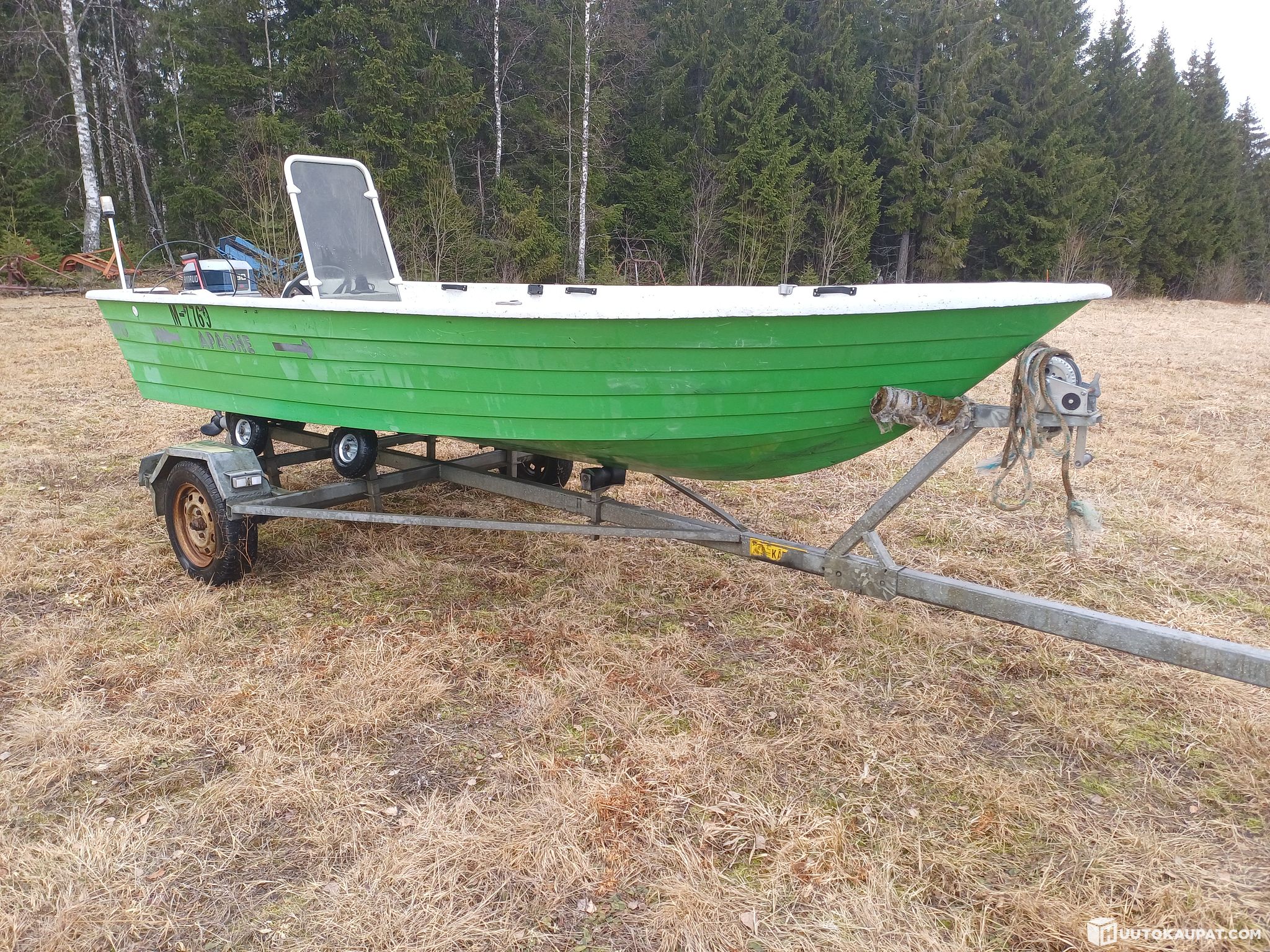 Myydään käytön puutteen vuoksi vm. 1988 Apache 470 moottorivene, jossa 30hv Evinrude moottori vm. 1990. Lisäksi kauppaan kuuluu Kärppä venetraileri vm. 1990. Vene ja traileri molemmat rekisterissä. Veneellä ajettu viimeksi vuonna 2017, jolloin toimi moitteettomasti. Kulkee oikein sujakasti tuolla moottorilla. Sähköstartti, pulpettiohjaus ja automaattinen pilssipumppu. Lowrance kaikuluotain n. vuodelta 2014 kuuluu kauppaan, ei näy kuvissa. Viimeisen ajon jälkeen seisonut veneilyinnostuksen puutteen vuoksi tallissa tilaa viemässä, nyt myydään pois enemmän tarvitsevalle.