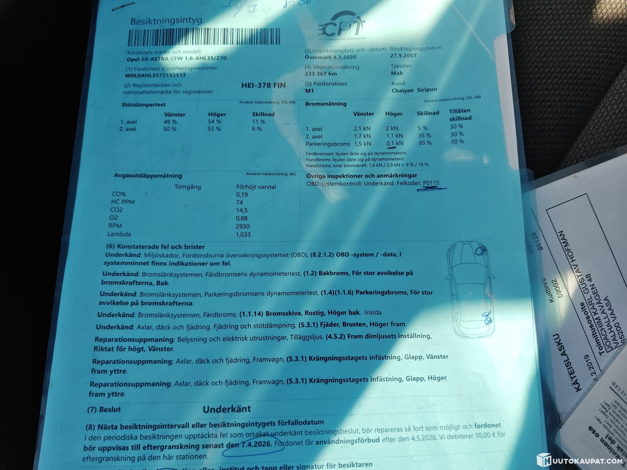 Ei katsastuksesta läpi. Korjauslista kuvissa.