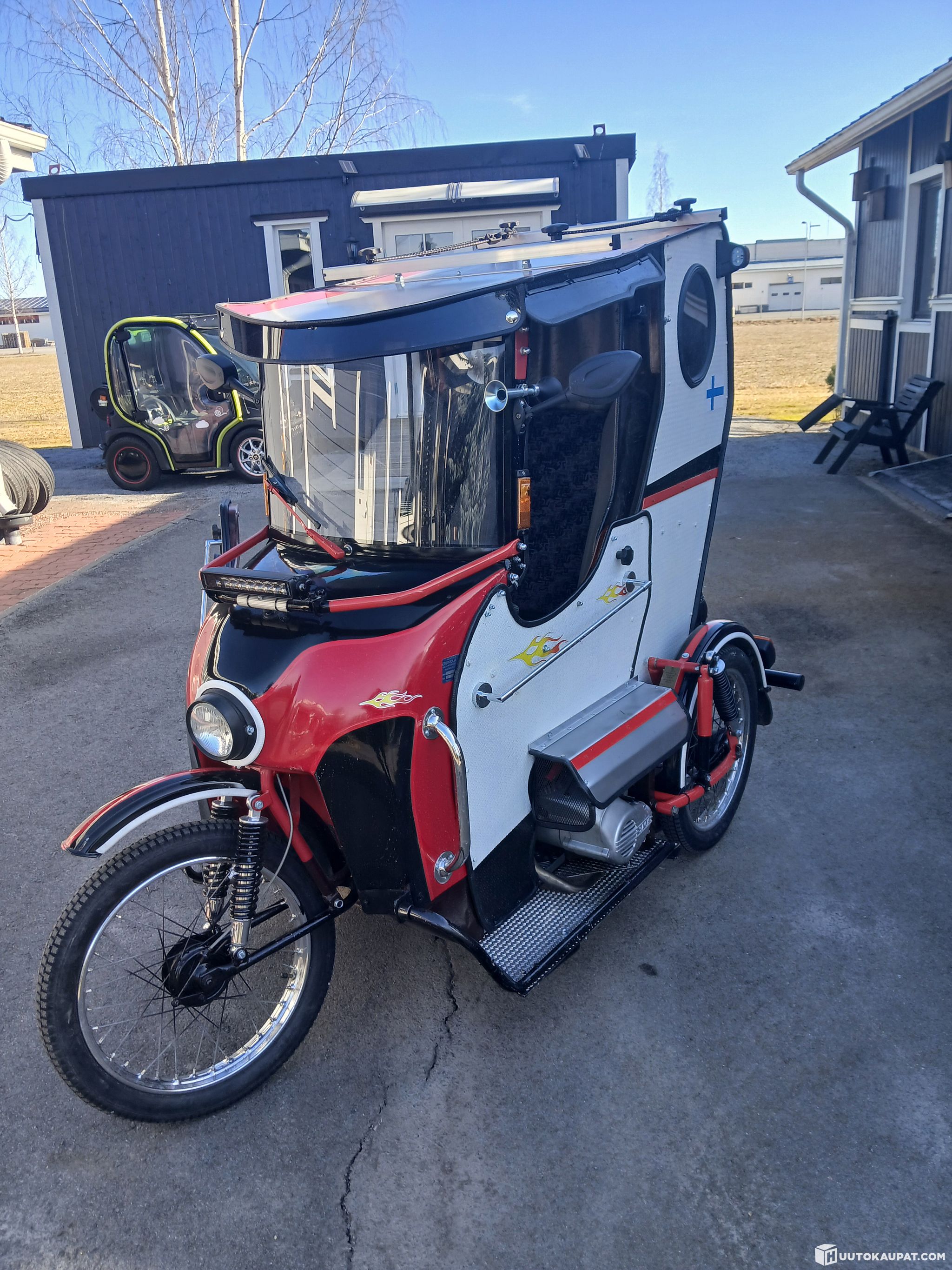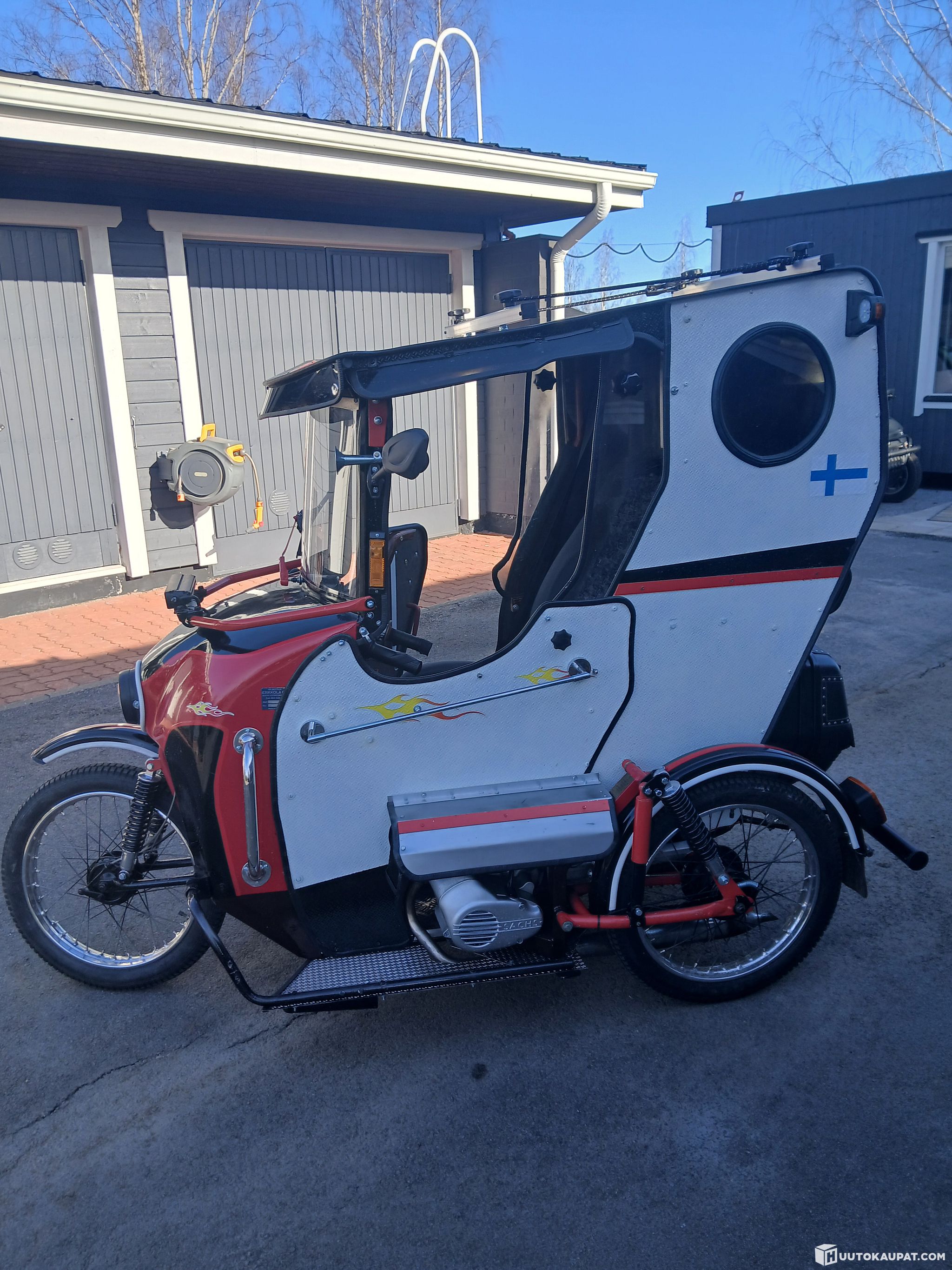 Erkkola 3 pyörä moposta rakenneltu varmasti hieman huomiota herättävä " hybridi" mopo.2 tahti Sachs 2.4 kw moottori 2 vaiht. automaatti laatikko +750w 48v sähkömoottori,