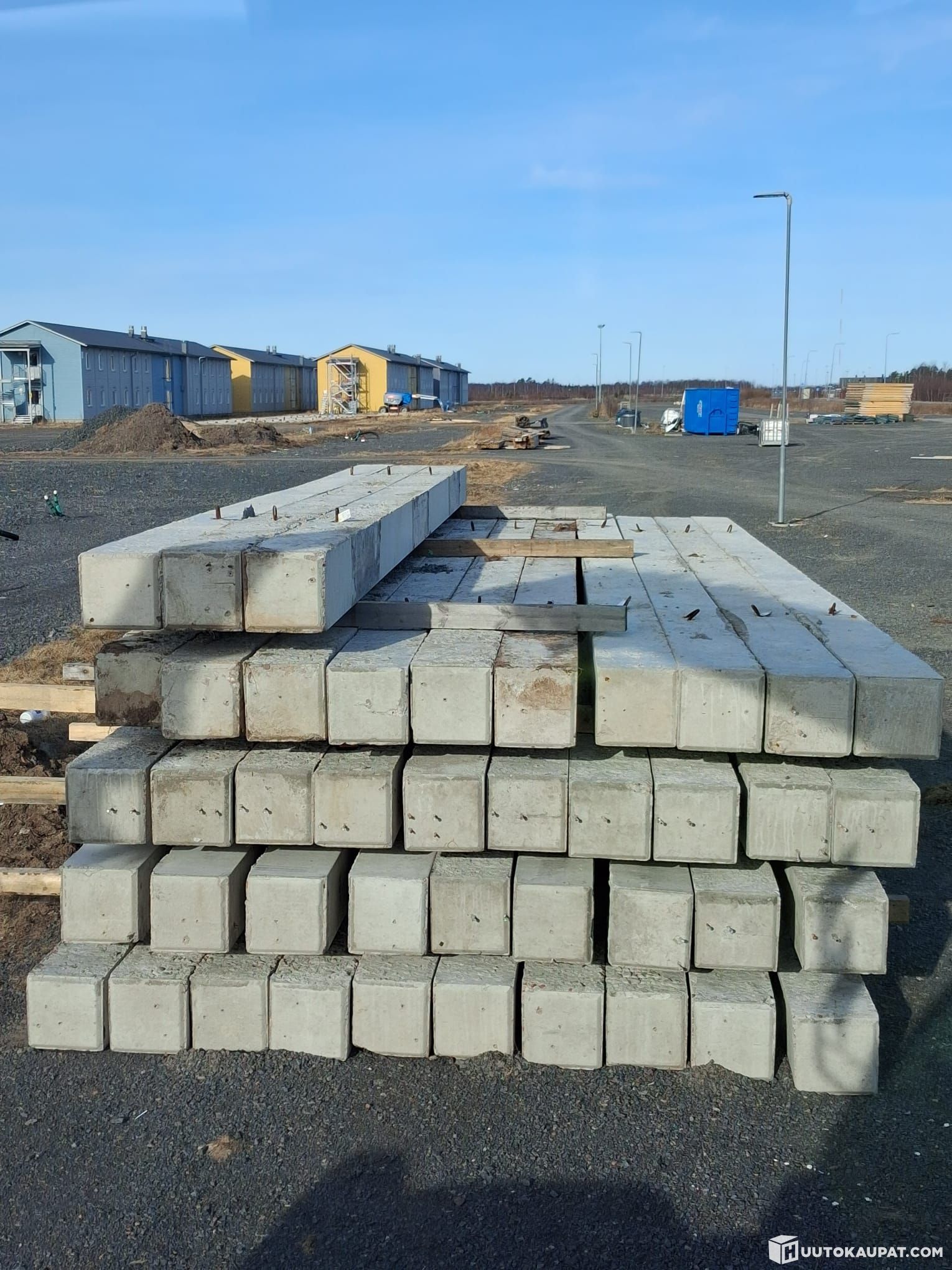 Käytettyjä 8 metrisiä betonipaaluja, nostolenkit sivulla. Kaikki kuvassa näkyvät paalut ei kuulu kauppaan, myydään 4kpl erissä. Paino n. 1700kg/kpl
