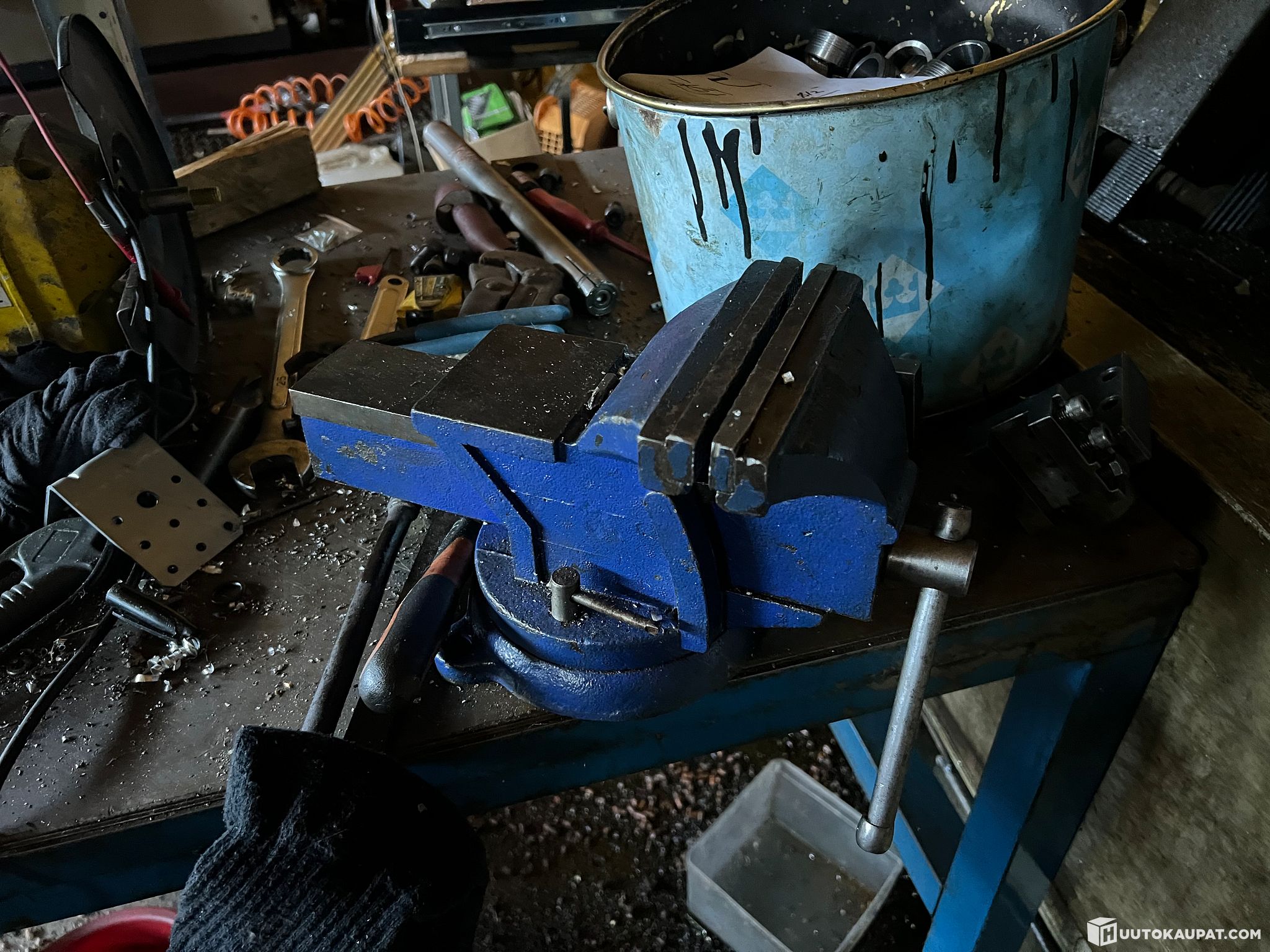 Työpöytä työkaluineen sekä ruuvipenkki