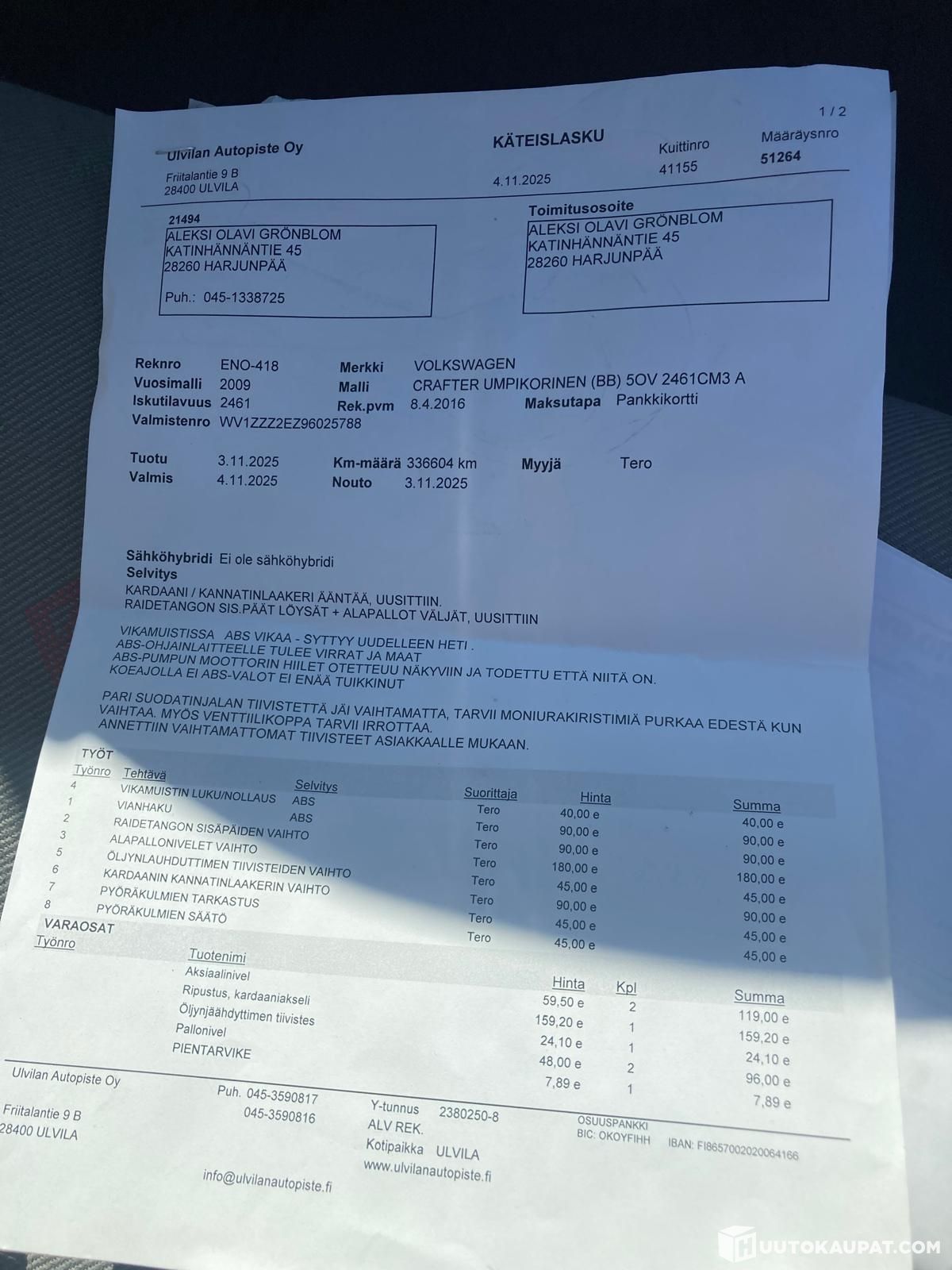 Autossa ei ollut huoltokirjaa, mutta ilmoituksessa kuvat huoltojen kuiteista