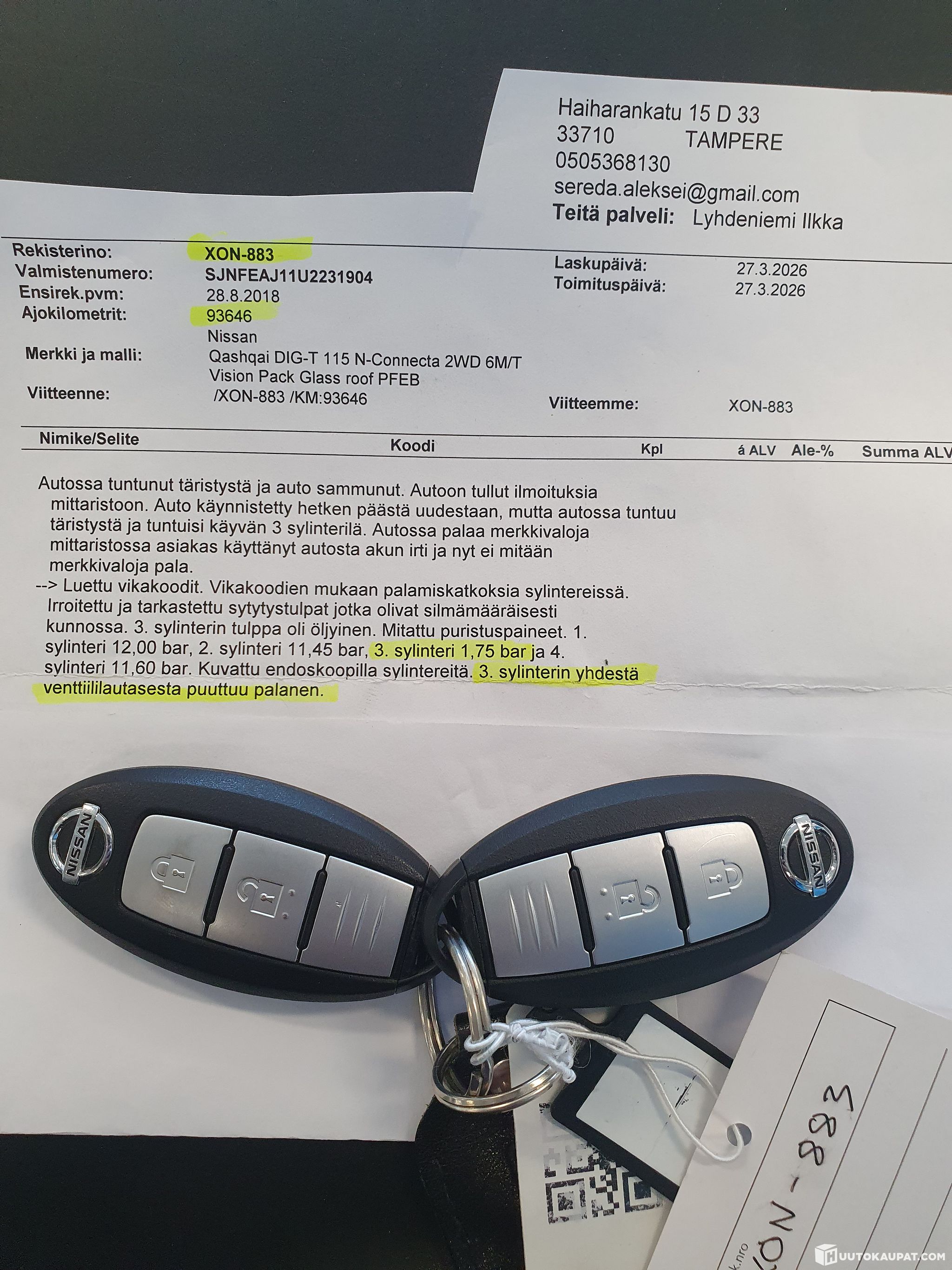 Kolmos sylinteristä puuttuu puristuspaineet ja yhdestä venttiililautasesta puuttuu palanen!